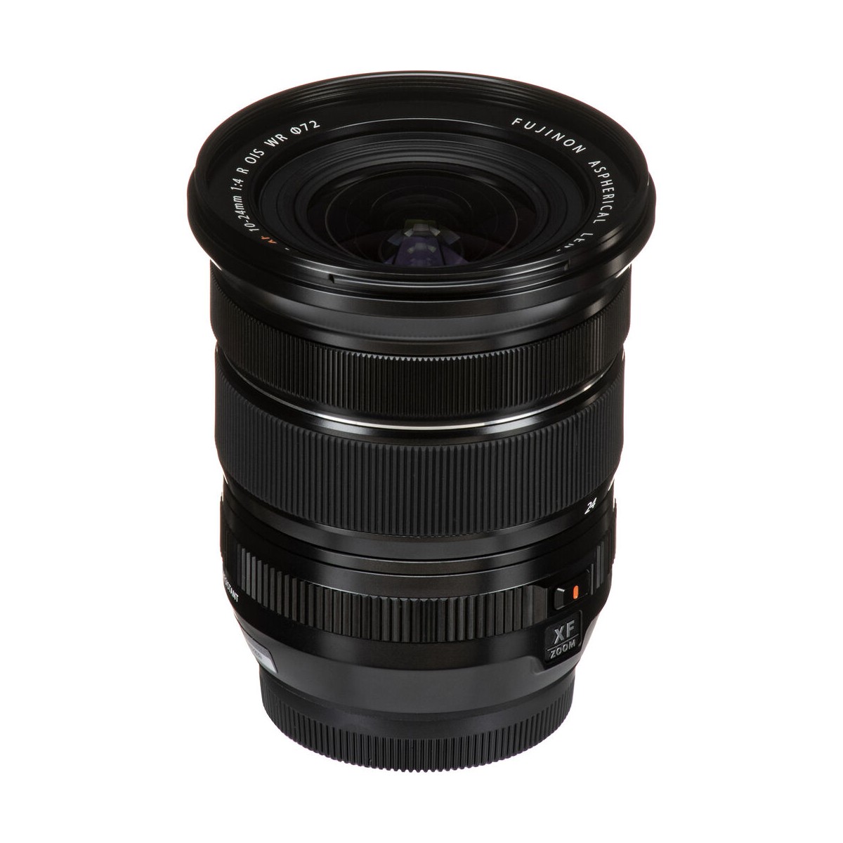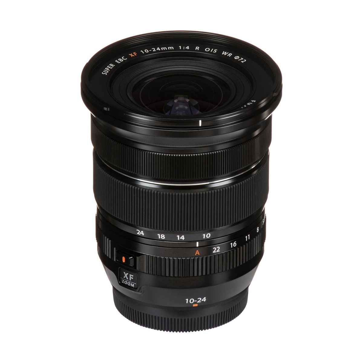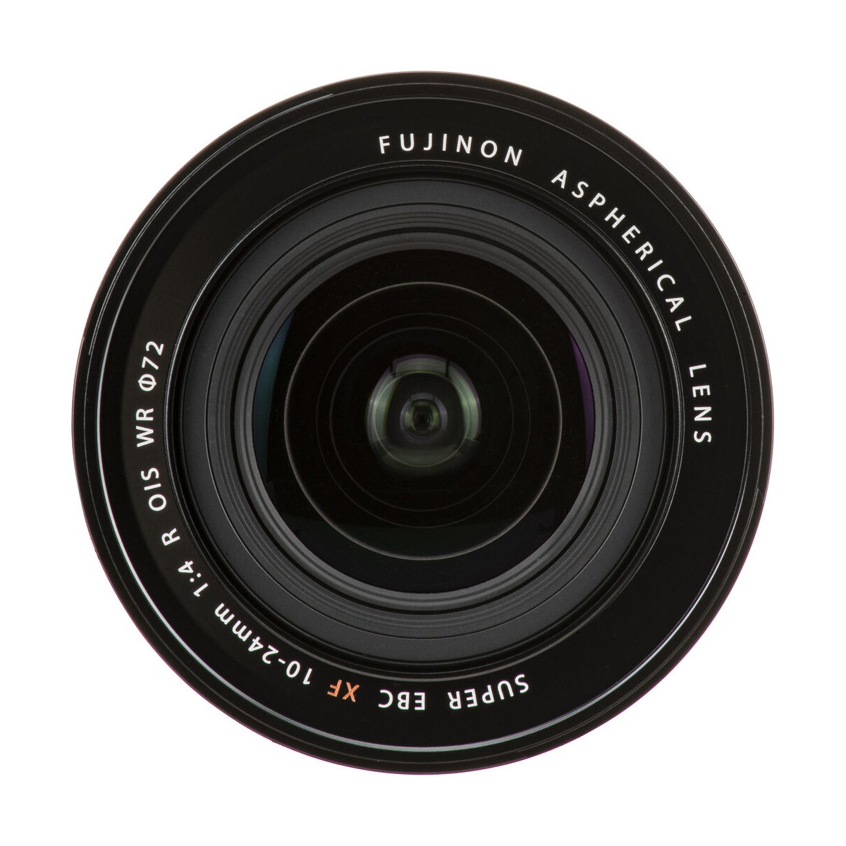 لنز XF 10-24mm f/4 R OIS WR فوجی یک لنز واید کارآمد، مقاوم در برابر آبوهوا و با ویژگیهای کنترلی شهودی است. فاصله کانونی معادل این لنز، هنگام استفاده از آن بر روی دوربینهای فول فریم برابر با ۳۶-۱۵ میلیمتر خواهد بود. حداکثر گشودگی دیافراگم f/4 این لنز در بازه زوم ثابت میماند و وجود عدسیهای ELD در چیدمان اپتیکال آن موجب به حداقل رسیدن انواع انحرافات اپتیکال شده است. به لطف استفاده از کوتینگ Super EBC در این لنز، از پدیده فلر و سایهدار شدن سوژهها جلوگیری میشود. این لنز دارای تثبیتکننده تصویر اپتیکال با قابلیت حذف اثر لرزش دوربین تا ۳.۵ استاپ است. این محصول از طراحی جدیدی بهرهمند است که موجب کوچکتر شدن حلقههای تنظیم فوکوس و گشودگی دیافراگم شده است. این لنز در برابر نفوذ آب و گردوغبار مقاوم است و میتوان از آن در شرایط آبوهوایی سخت استفاده کرد.
