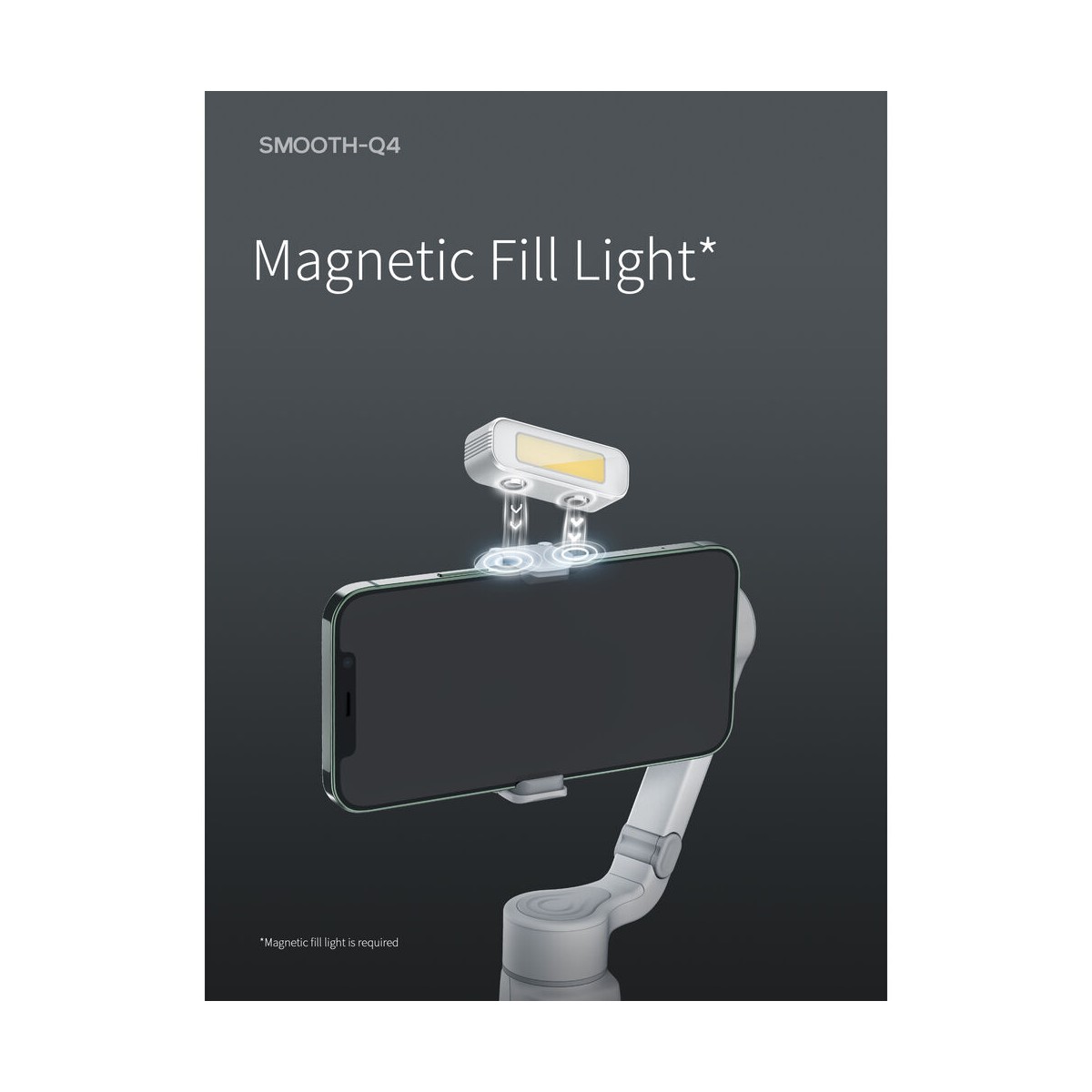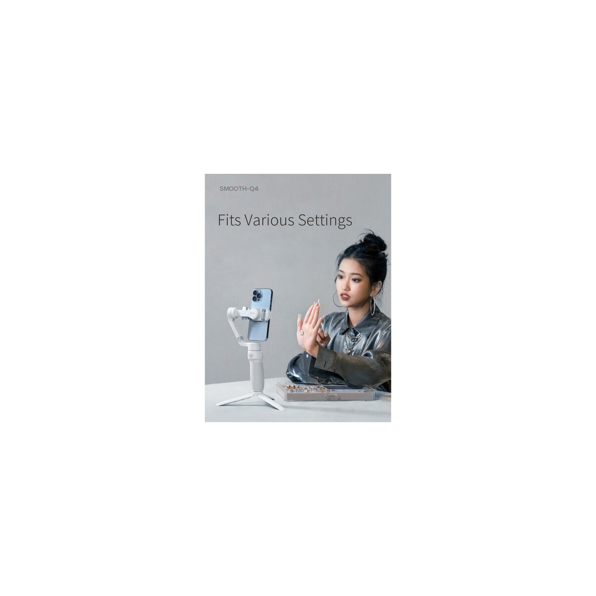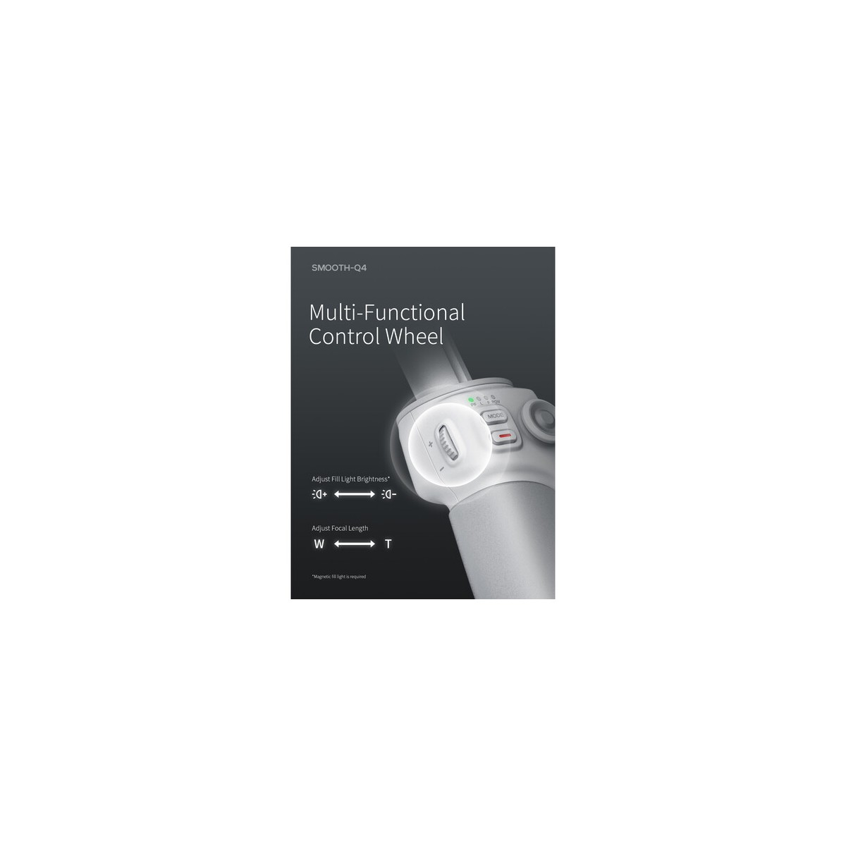 گیمبال اسموث Q4 ژیون نسخهای با طراحی مشابه اما بهروز شده از نسخه قبلی خود است که همراه با یک نور آهنربایی با روشنایی ۵۲۰ لومن عرضه شده است. به این گیمبال یک دستگیره تلسکوپی اضافه شده است که با وجود آن امکانات بیشتری برای تصویربرداری در اختیار کاربران قرار گرفته است. گیمبال Smooth Q4 میتواند گوشیهای هوشمند تا وزن ۲۸۰ گرم را بر روی خود تحمل کند. کاربران این گیمبال میتوانند از اپلیکیشن دستیار توسعه داده شده برای دستگاههای اندروید و iOS به همراه این گیمبال استفاده کنند که با استفاده از آن تمپلیتهای متنوع، ابزارهای ویرایش و قابلیتهای کنترلی بیشتری به گیمبال اضافه خواهد شد. تغییر حالت تصویربرداری از حالت افقی به عمودی و برعکس در این گیمبال با فشار دادن یک دکمه امکانپذیر است.