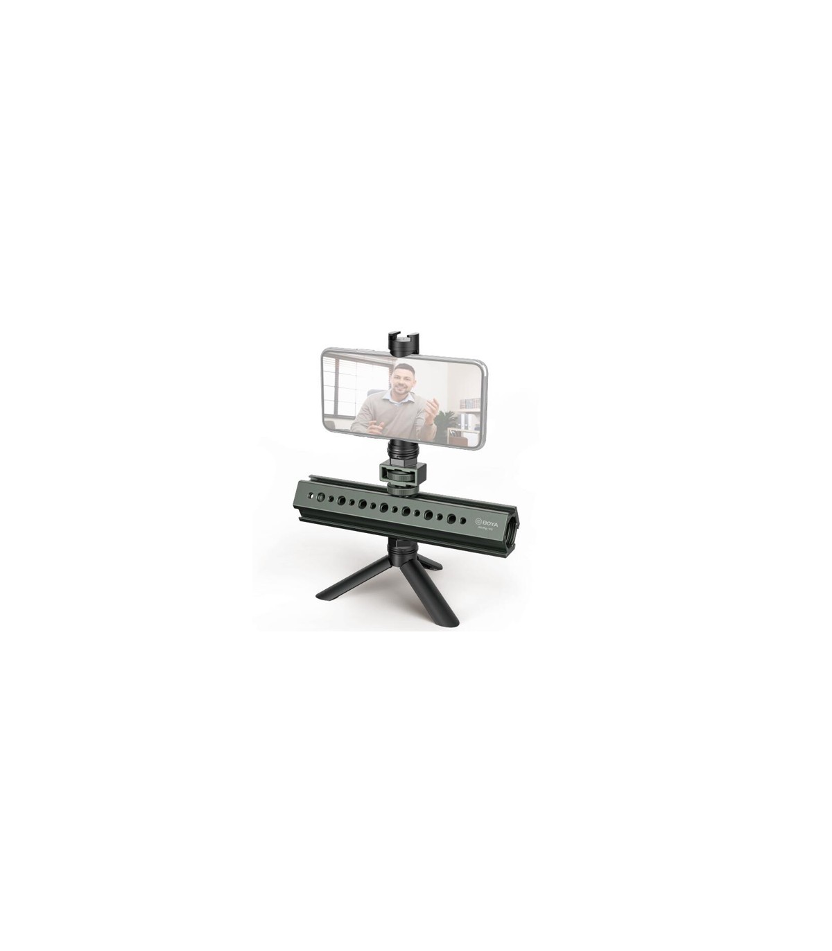 کیت کارآمد MicRig-VG دارای قسمت‌های مختلفی برای مانت لوازم جانبی، گیره موبایل و یک سه‌پایه کوچک است.