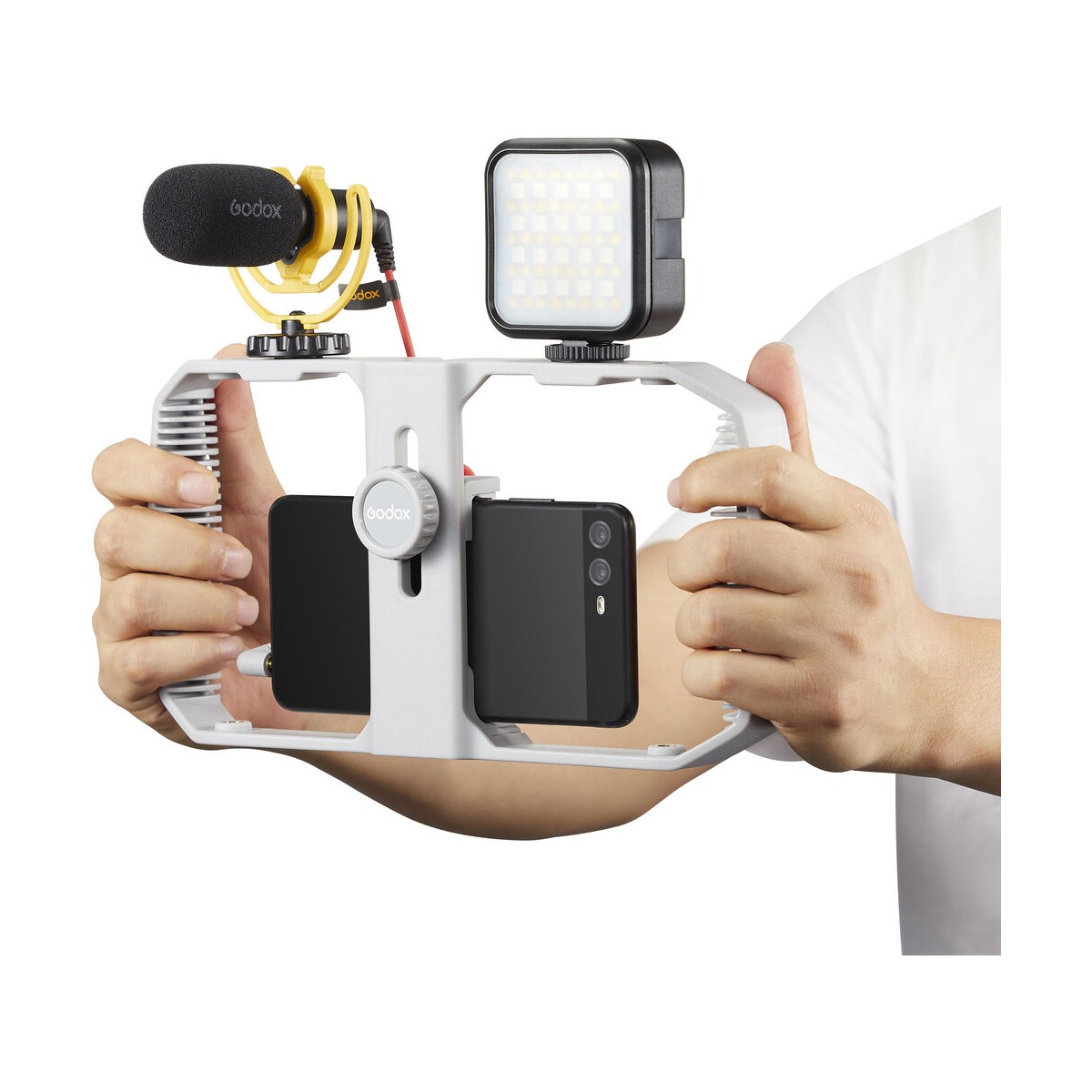 این گریپ دارای دو دستگیره است که امکان فیلمبرداری آسانتر و اجرای تکنیکهای مختلف به همراه گوشیهای هوشمند را مهیا کرده است و همچنین میتوانید با استفاده از آن گوشی خود را به آسانی در زوایای مختلف در دست بگیرید و کادرهای زیبایی را ببندید. بر روی این گریپ سه مانت کفشکی و شش شیار مانت یک چهارم اینچی وجود دارد و با استفاده از آنها میتوان انواع لوازم جانبی مانند نور و میکروفون را بر روی گریپ متصل کرد.