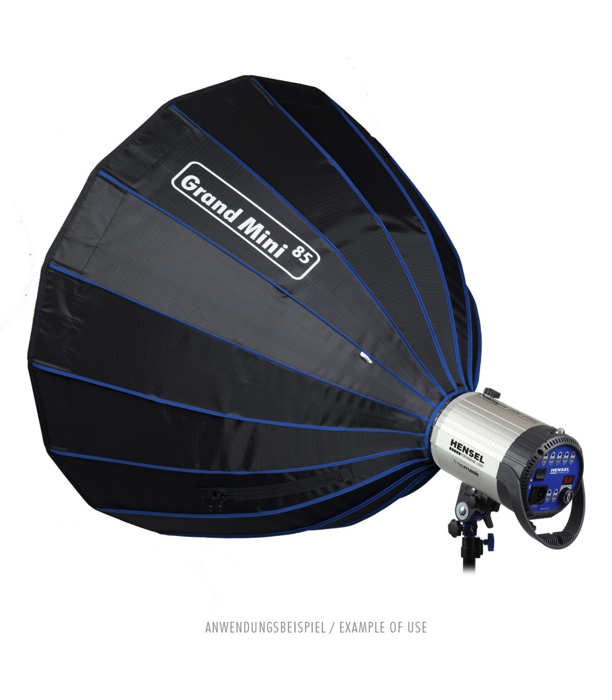در این برای رسیدن به نوری یکنواخت و نرم، یک سافتباکس با طراحی پارابولیک در نظر گرفته شده است. سافت باکس Grand Mini هنسل قطر دهانهای ۸۵ میلیمتری دارد و بسیار سریع و راحت، مثل یک چتر میتوان آن را باز کرد. این سافت باکس با برخورداری از یک اسپیدرینگ با مانت رمخصوص هنسل برخوردار است و فقط قابل اتصال به فلاشهای هنسل می باشد. جداره درخلی این سافتباکس نقره رنگ است و دارای دو دیفیوزر داخلی و خارجی است.