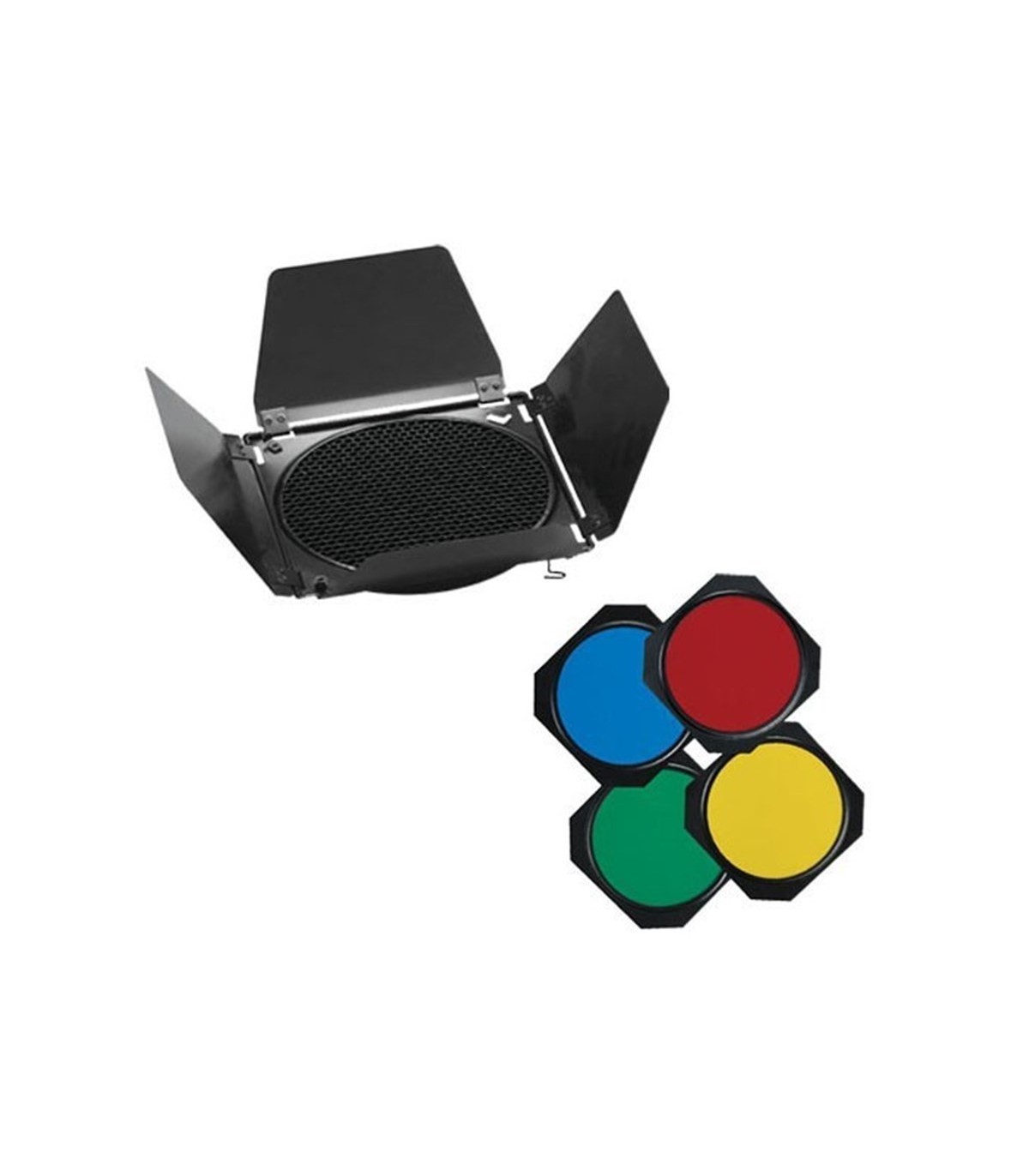 در کنار این سه هد فلاش، دو کاسه استاندارد و سه عدد پایه نور بادی نیز در نظر گرفته شده تا بتوان موقعیت و وضعیت نورها را در حالت مورد نظر تنظیم کرد. از دیگر تجهیزاتی که در این مجموعه در نظر گرفته شده میتوان به یک سافتباکس ۱۰۰×۸۰ و یک چتر مشکی با جداره داخلی نقرهای اشاره کرد. با استفاده از این دو ابزار میتوان نور یکنواختتری را بر روی سوژه تاباند و شاهد سایههایی محوتری بود.