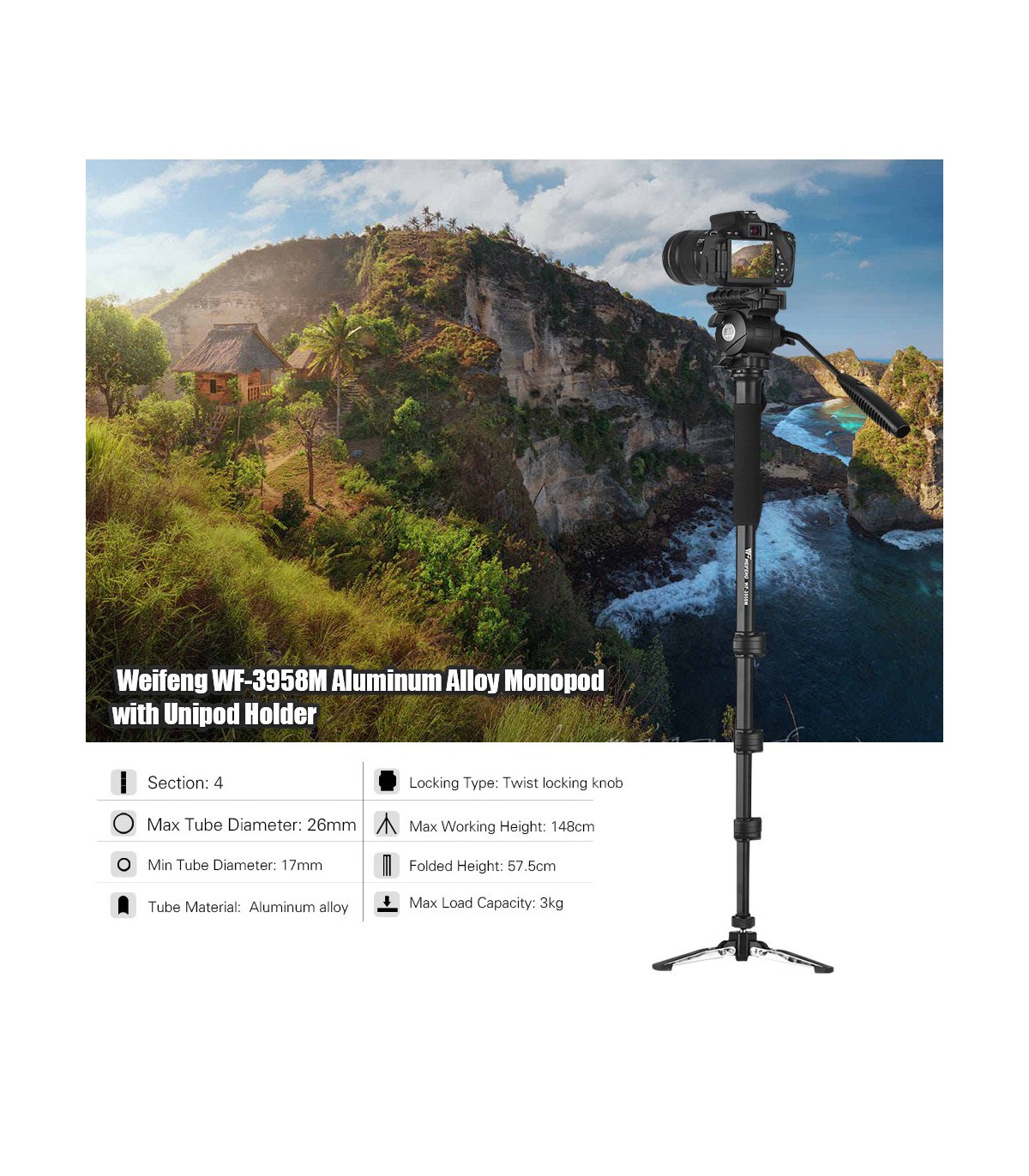 سهپایه آلومینیومی ویفنگ مدل WT-3958M نیز از محصولات همین کمپانی میباشد. وزن کلی این محصول برابر ۱.۳۱ کیلوگرم بوده و دارای تحمل وزن حداکثر ۳ کیلوگرمی میباشد. ارتفاع این محصول در بیشترین حالت ۱۴۸ سانتیمتر خواهد بود. پایه این محصول دارای ۴ قسمت بوده و از قفل فلیپ لاک برخوردار میباشد.