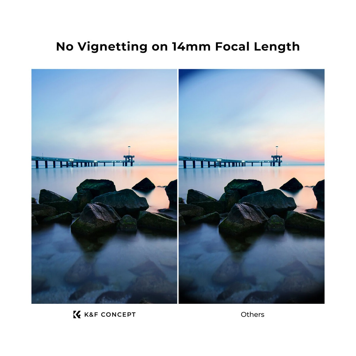 یکی از مشکلات رایج در فیلترهای ND، ایجاد وینیت در گوشههای تصویر است. فیلتر K&F Concept C-Series با طراحی باریک و قاب آلومینیومی سبک، این مشکل را برطرف کرده و امکان استفاده از آن روی لنزهای واید را بدون افت کیفیت تصویر فراهم میکند.