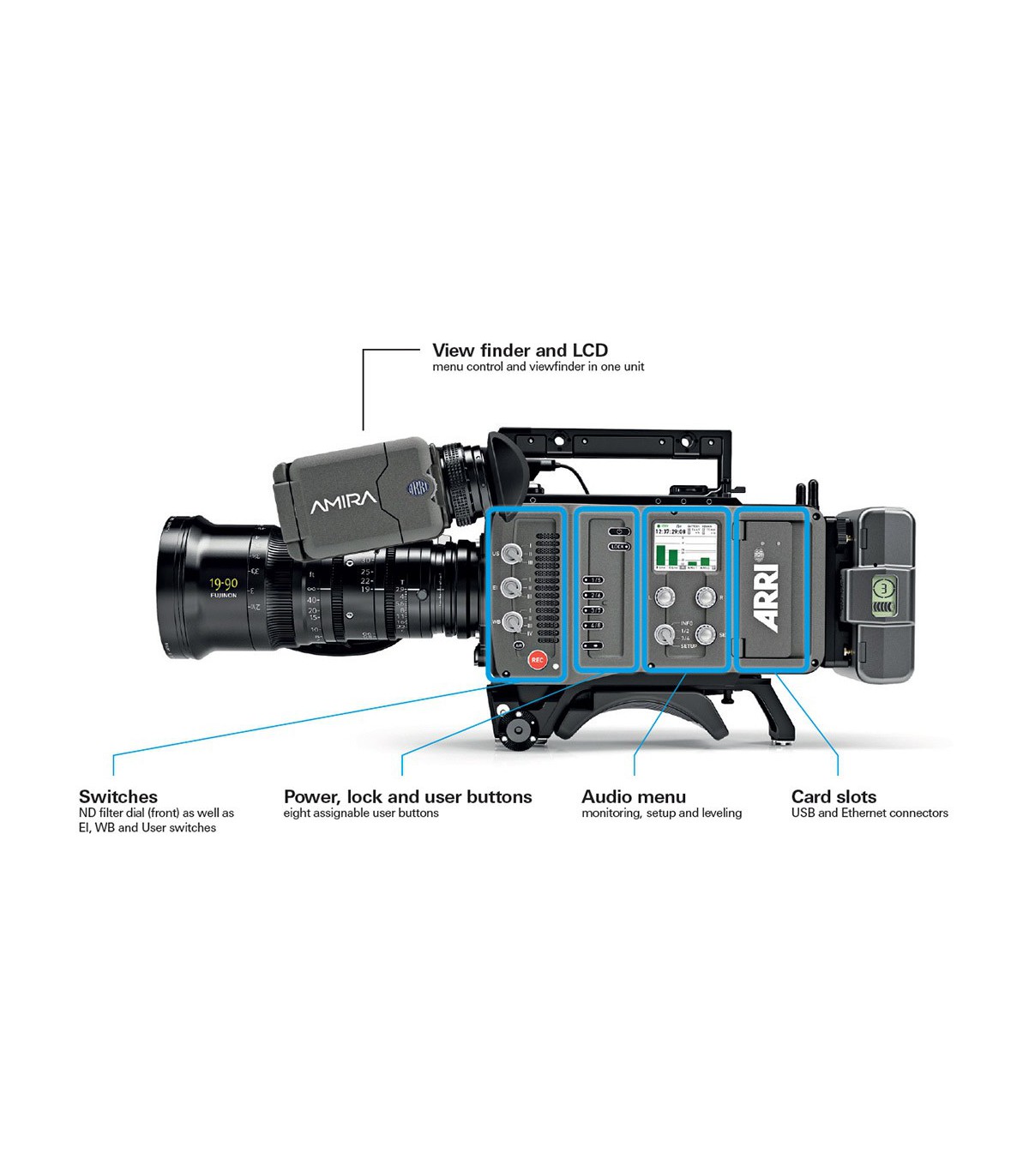 دستگیره بالایی این دوربین بهصورت جداشونده طراحی شده و علاوه بر آن بخش جداشوندهی دیگری هم در قسمت زیرین نصب میشود که قرارگیری AMIRA Premium بر روی شانه را تسهیل میکند. این بخش به شکل کشویی بوده و قابل تنظیم است. تعداد کلیدهای روی بدنه و چیدمان آنها بسیار مناسب است، ضمن اینکه همهی کلیدها دارای نور پسزمینه هستند که استفاده از آنها در شرایط نوری ضعیف و محیطهای تاریک و کمنور به مراتب آسانتر میکند. امکان تغییر و بهروزرسانی سختافزاری این بدنه، در کنار امکان بهروزرسانی نرمافزاری هم قابلیت کارآمد دیگری است که برای یک دوربین ساخت ARRI چیز چندان جدید و شگفتآوری به حساب نمیآید.