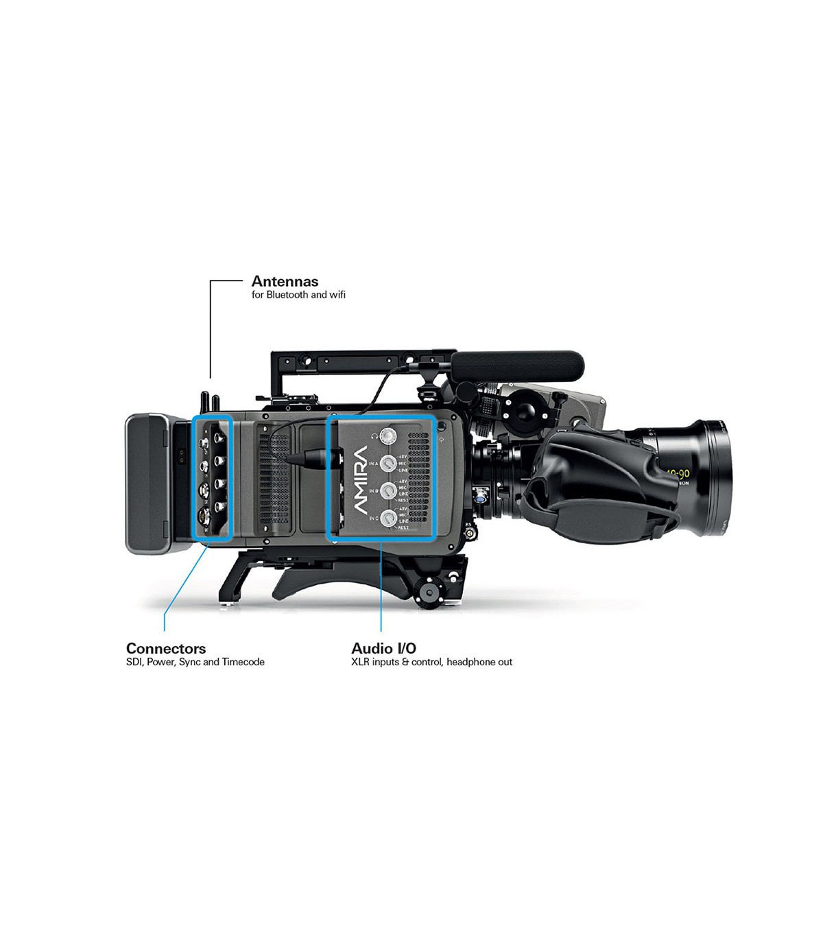 بر روی بدنه این دوربین دو خروجی تصویر HD-SDI، ورودی و خروجی Timecode و خروجیهای برق Hirose و Lemo به چشم میخورد. یک خروجی هدفون برای بررسی و مانیتورینگ صدا و سه ورودی حرفهای XLR (یک ورودی 5pin و دو ورودی 3pin) که امکان ضبط صدا در چهار کانال مجزا را به AMIRA Premium میدهند نیز مهمترین موارد مربوط به قابلیتهای صدابرداری هستند. تصاویر و اطلاعات ضبطشده توسط این دوربین روی کارتهای Cfast 2.0 ثبت میشوند که دو شکاف برای آنها در نظر گرفتهشده و دو درگاه USB و یک درگاه اترنت نیز در کنار این خشاب جای گرفته است.