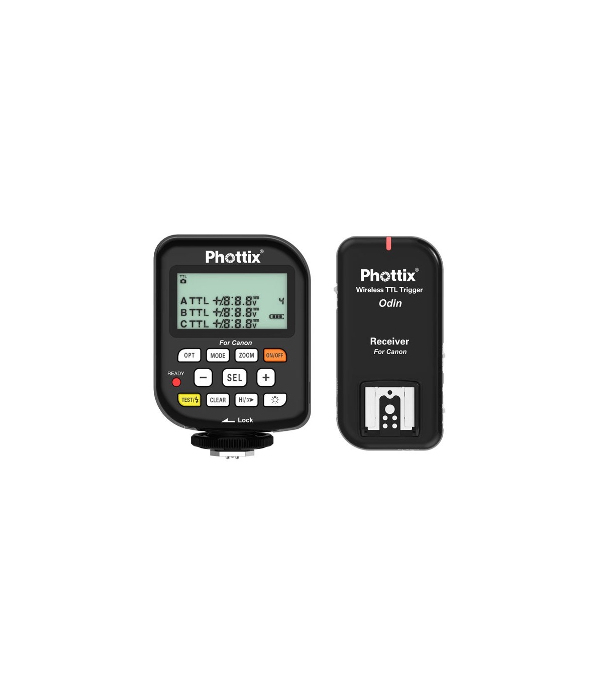 گیرندهی اودین هم با طراحی ساده و کوچک، بسیار کارآمد است. اتصال ¼ اینچ این گیرنده، اتصال آن را به پایههای نور امکانپذیر میکند. علاوه بر این، اتصال مشابه اتصال فلاش رویدوربین (cold-shoe) نیز، بسیار کاربردی است و میتوان از آن برای اتصال گیرنده به لوازم جانبی مانند نگهدارندههای چتر استفاده نمود. دکمههای مربوط به کانال و گروه نیز به صورت جداگانه بر روی بدنهی این گیرنده قرار گرفتهاند تا سادهترین روش استفاده را در اختیار کاربر قرار دهند.