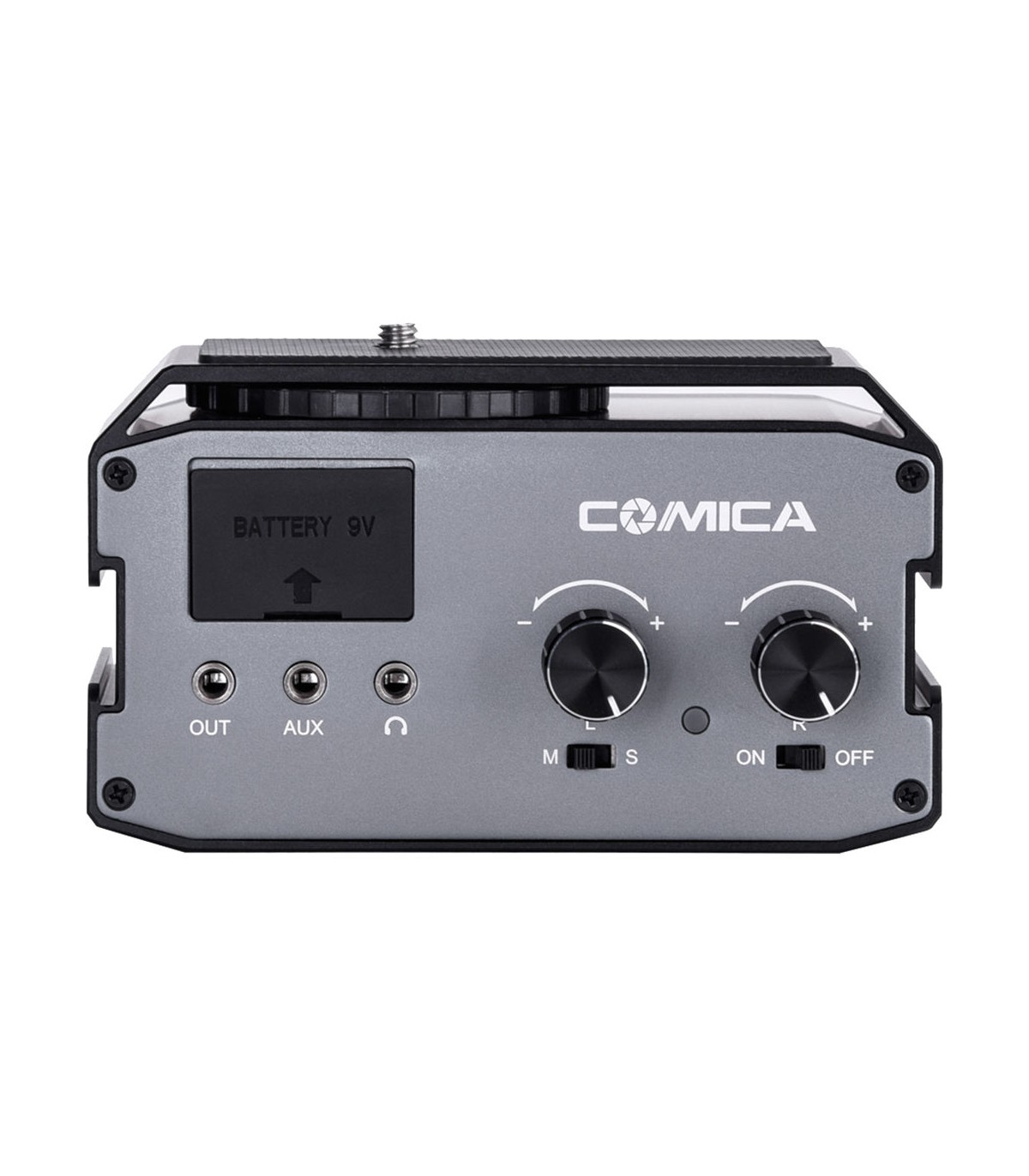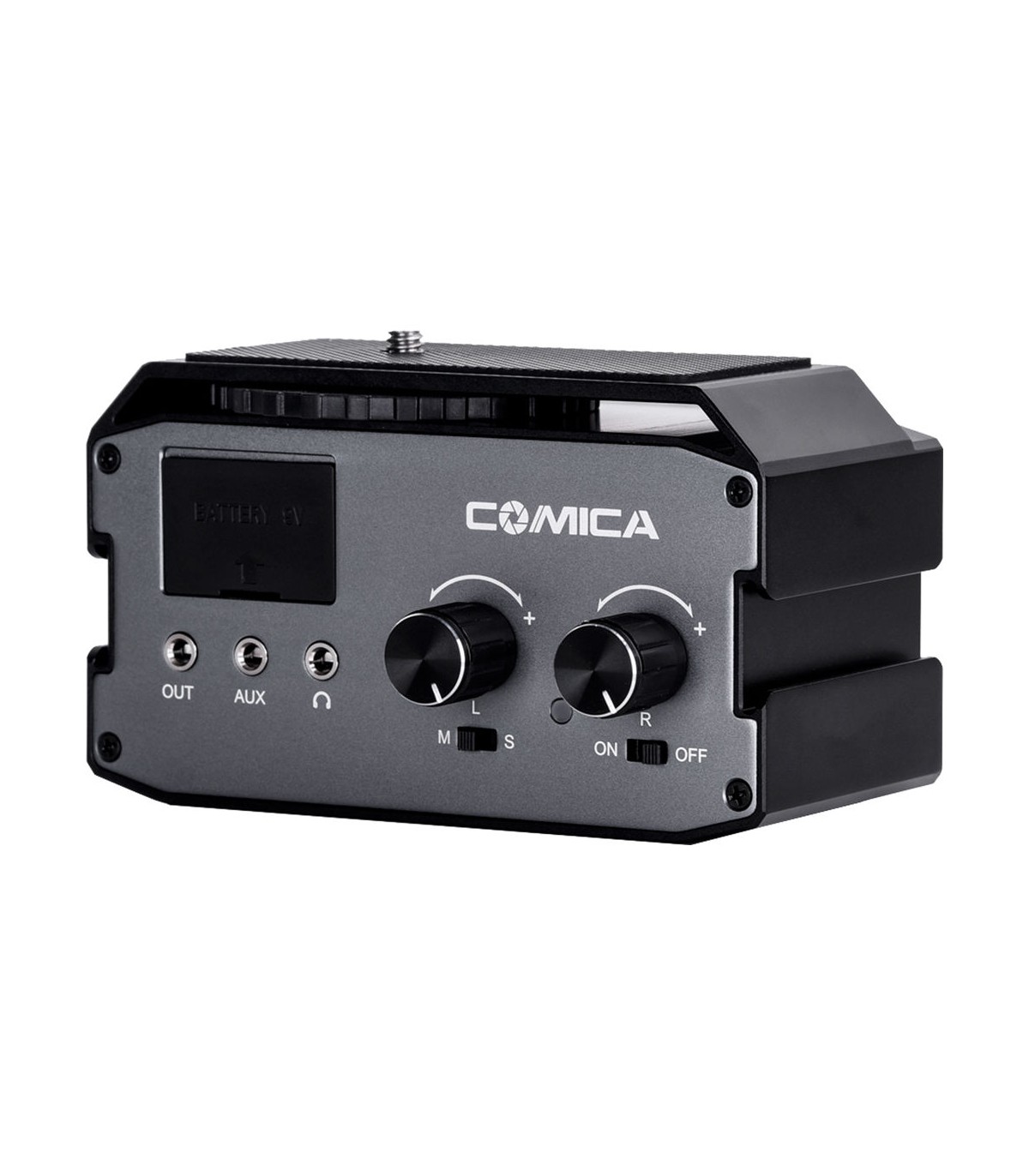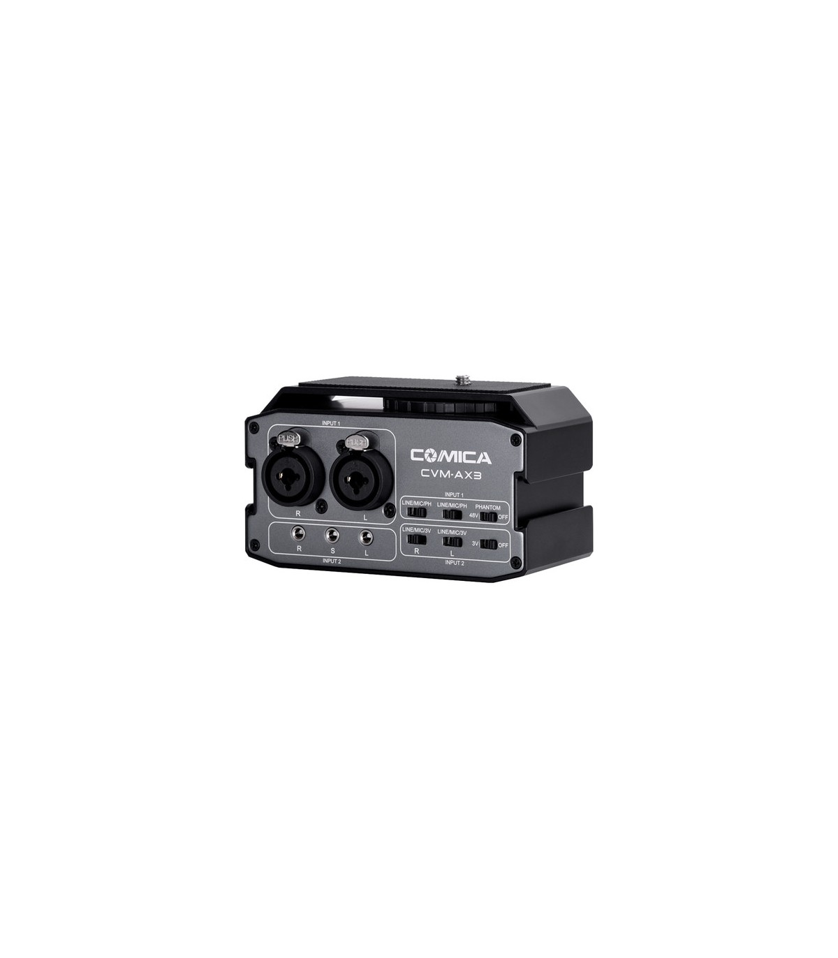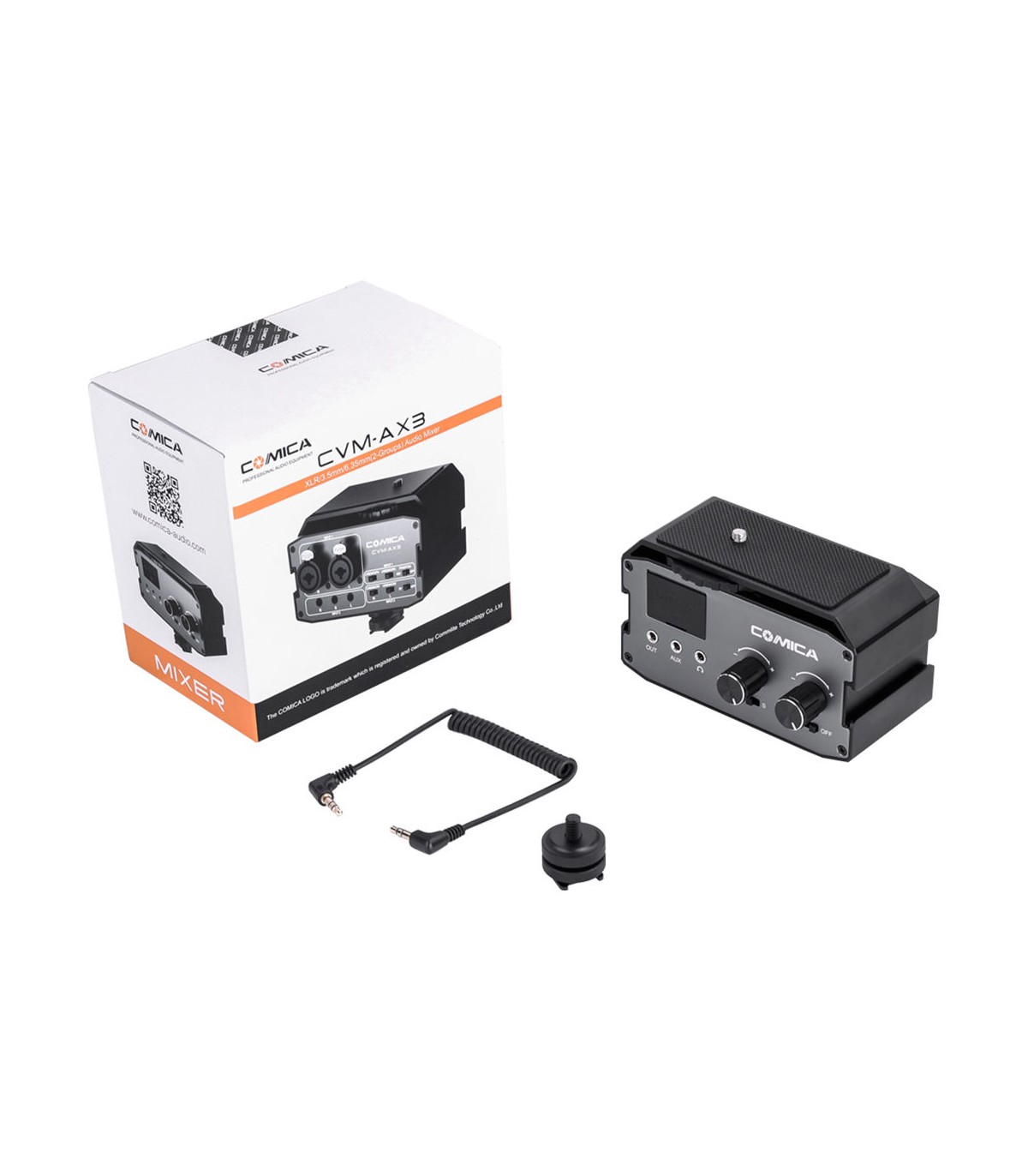 میکسر صدای دو کاناله کامیکا Comica CVM-AX3 برای ضبط صدای میکروفون، سازها یا ورودی صدا با دوربین DSLR به کار می رود. این میکسر دو کاناله برای تولید ویدئو، موزیک ویدئو و غیره طراحی شده است. با مانت کردن این میکسر بر روی دوربین یا سه پایه، همچنان با استفاده از کلد شو تعبیه شده بر روی آن می توان تجهیزات دیگری را بر روی آن مانت کرد. این میکسر شامل دو PreAmp داخلی با پیچ کنترل Gain مجزا است که از طریق جک کمبو XLR-1/4” یا 3.5 میلی متری می توان آن ها را تغذیه کرد. برای سازگاری کامل با تمامی میکروفون های کاندنسر، یقه ای و شات گان، این میکسر قابلیت تأمین برق 48 ولتی فانتوم پاور یا 3 ولتی پلاگین را دارد.