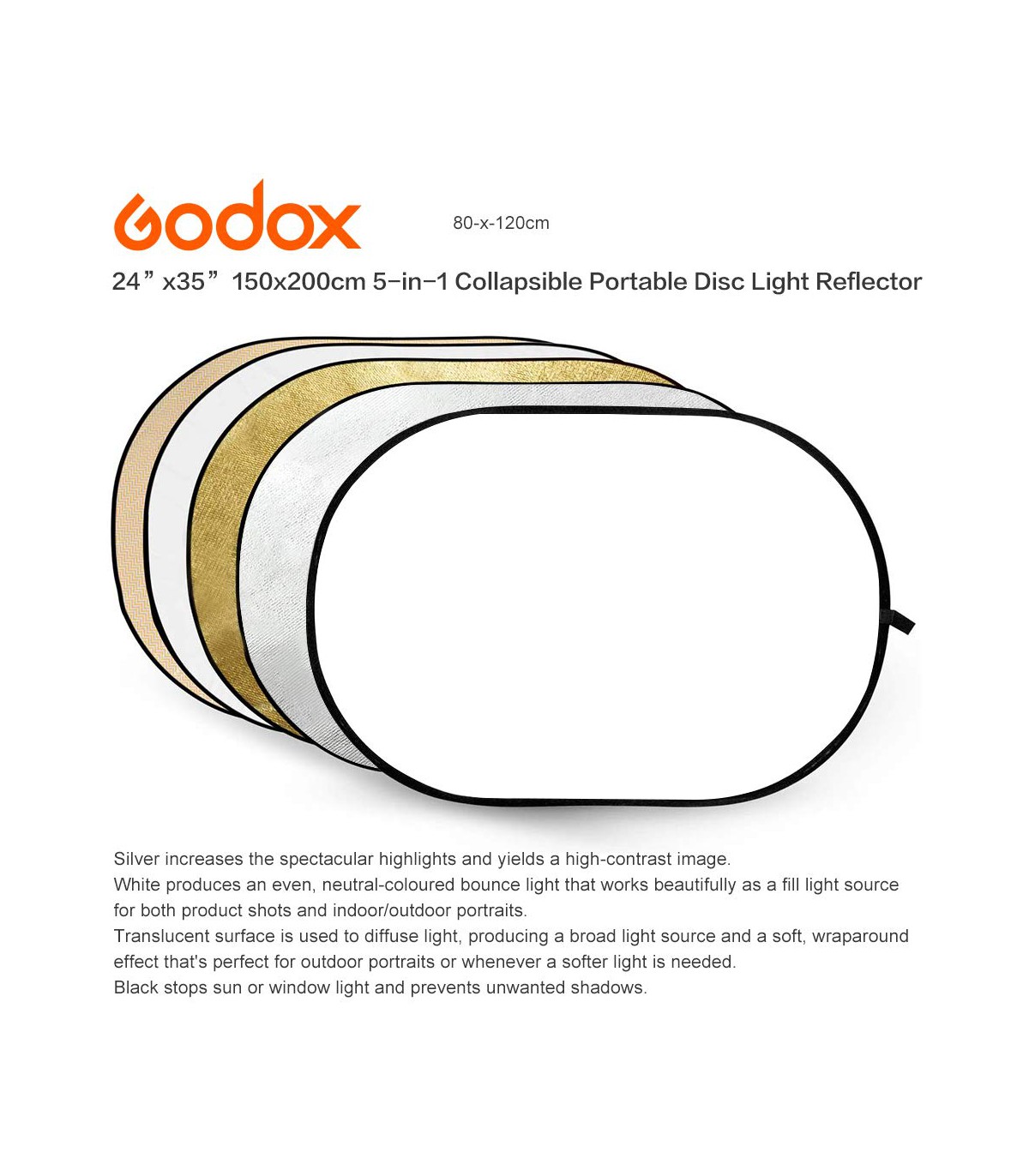 این رفلکتور ۵ کاره برای کار در آتلیه و محیط خارجی بسیار مناسب است. این رفلکتور ۵ رنگ دارد: نقرهای، طلایی، سفید مات، سفید نیمه شفاف و مشکی. این رفلکتور برای عکاسی پرتره، طبیعت بیجان، کلوزآپ و عکاسی صنعتی بسیار مناسب است. از این رفلکتور میتوان به همراه نور طبیعی، نور فلاش، یا انواع منابع دیگر نوری، برای عکاسی و فیلمبرداری استفاده نمود. این رفلکتور بهراحتی جمع میشود و در کیف آن جای میگیرد.