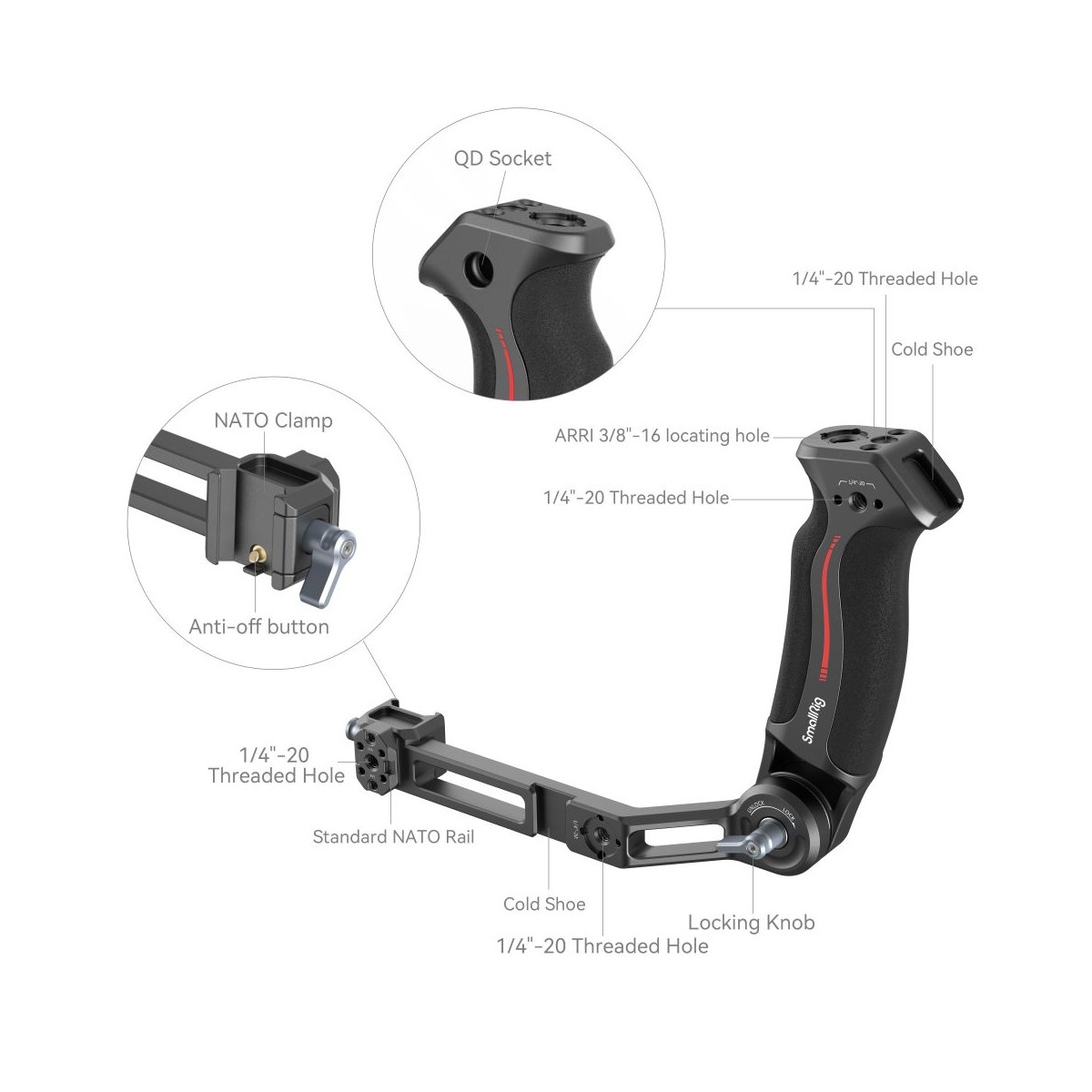 افزون بر این، وجود رزوههای 1/4"-20، محلهای ARRI 3/8"-16 و پایهی Cold Shoe امکان اتصال تجهیزات جانبی نظیر میکروفون، مانیتور یا چراغ را فراهم میکند. این ویژگی، Sling Handle را به ابزاری چندمنظوره تبدیل کرده که علاوه بر راحتی حمل، قابلیت گسترش سیستم فیلمبرداری را هم دارد.
