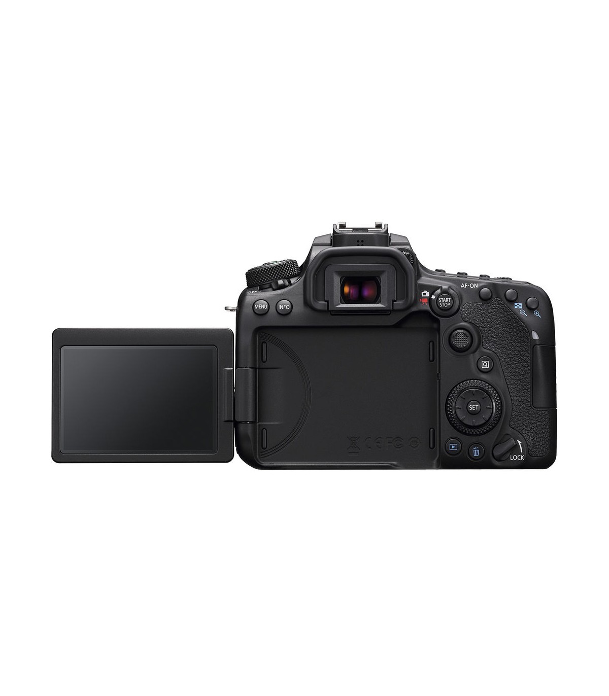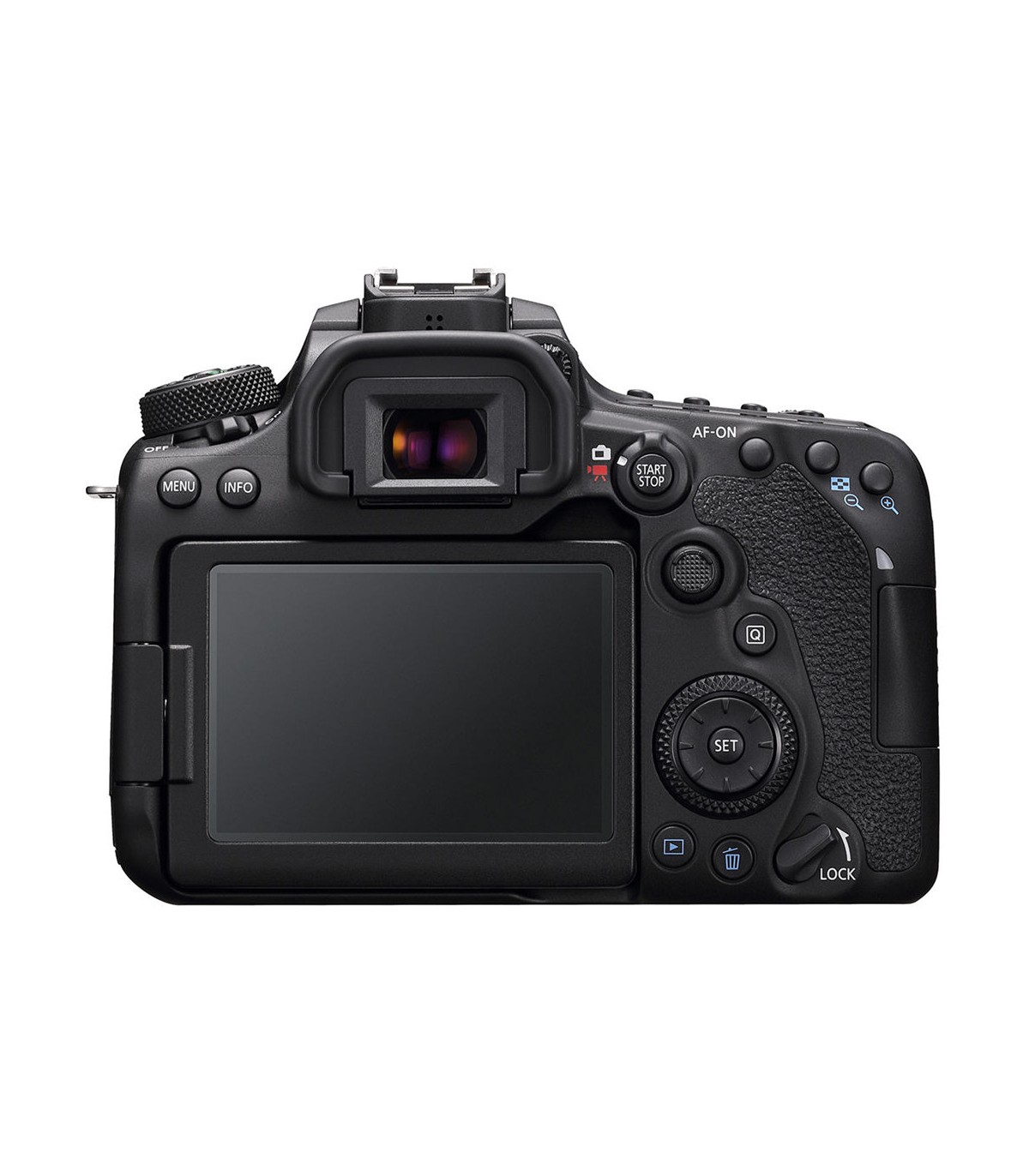 در بخش پشتی کانن 90D نمایشگر LCD آن تعبیه شده که دارای قطر ۳ اینچی بوده و قابلیت استفاده لمسی را نیز دارد. این صفحهنمایش قابل چرخش بوده و به کاربر امکان کادربندی در زوایای گوناگون را میدهد. همچنین پشتیبانی آن از استفاده لمسی موجب سهولت کار کردن با دوربین، چه در منوها و چه در پروسه فوکوس کردن خواهد شد.