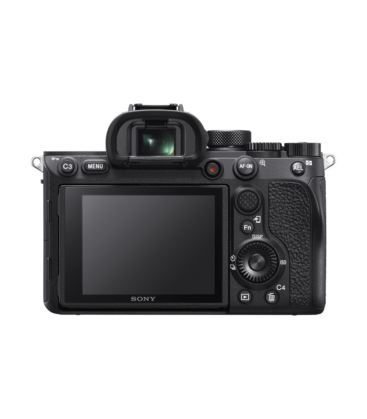 در بخش پشتی سونی a7R IV نمایشگر ۳ اینچی دستگاه قرار دارد که از یک پنل LCD با رزولوشن ۱.۴۴ میلیون نقطه برخوردار است. این نمایشگر علاوه بر قابلیت استفاده لمسی، امکان چرخش هم داشته تا فرآیند کادربندی برای کاربر راحتتر صورت گیرد. در بالای نمایشگر نیز منظره یاب الکترونیکی دوربین قرار گرفته که دارای رزولوشن بسیار بالای ۵.۷۶ میلیون نقطهای است که توسط یک پنل OLED در اختیار کاربر قرار میگیرد. علاوه بر رزولوشن بالا، این منظره یاب دارای سرعت بهروزرسانی (Refresh Rate) بالای ۱۲۰ فریم بر ثانیهای نیز هست.