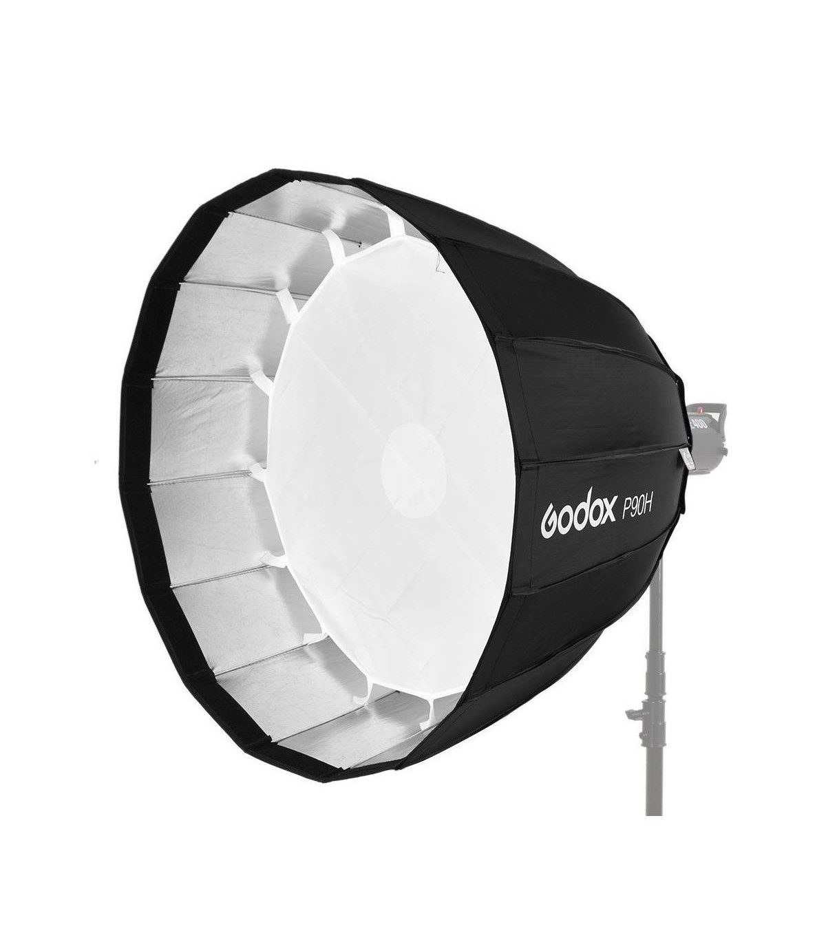 سافت باکس سافت باکس پارابولیک گودوکس Godox P90H همانگونه که از نامش پیداست یکی سافتباکس سهمی شکل با عمق بیشتر نسبت به سافت باکس های رایج است. این نوع سافت به دلیل دارابودن عمق بیشتر نور را به شکل بهتری به سمت سوژه هدایت میکند.