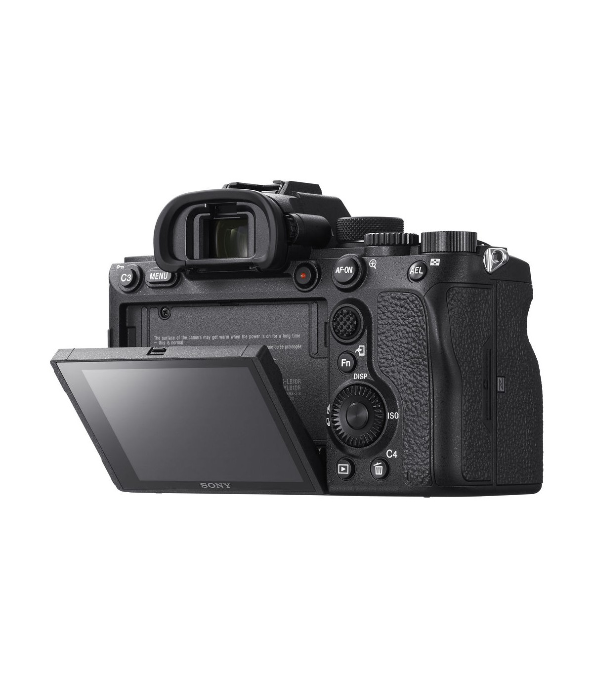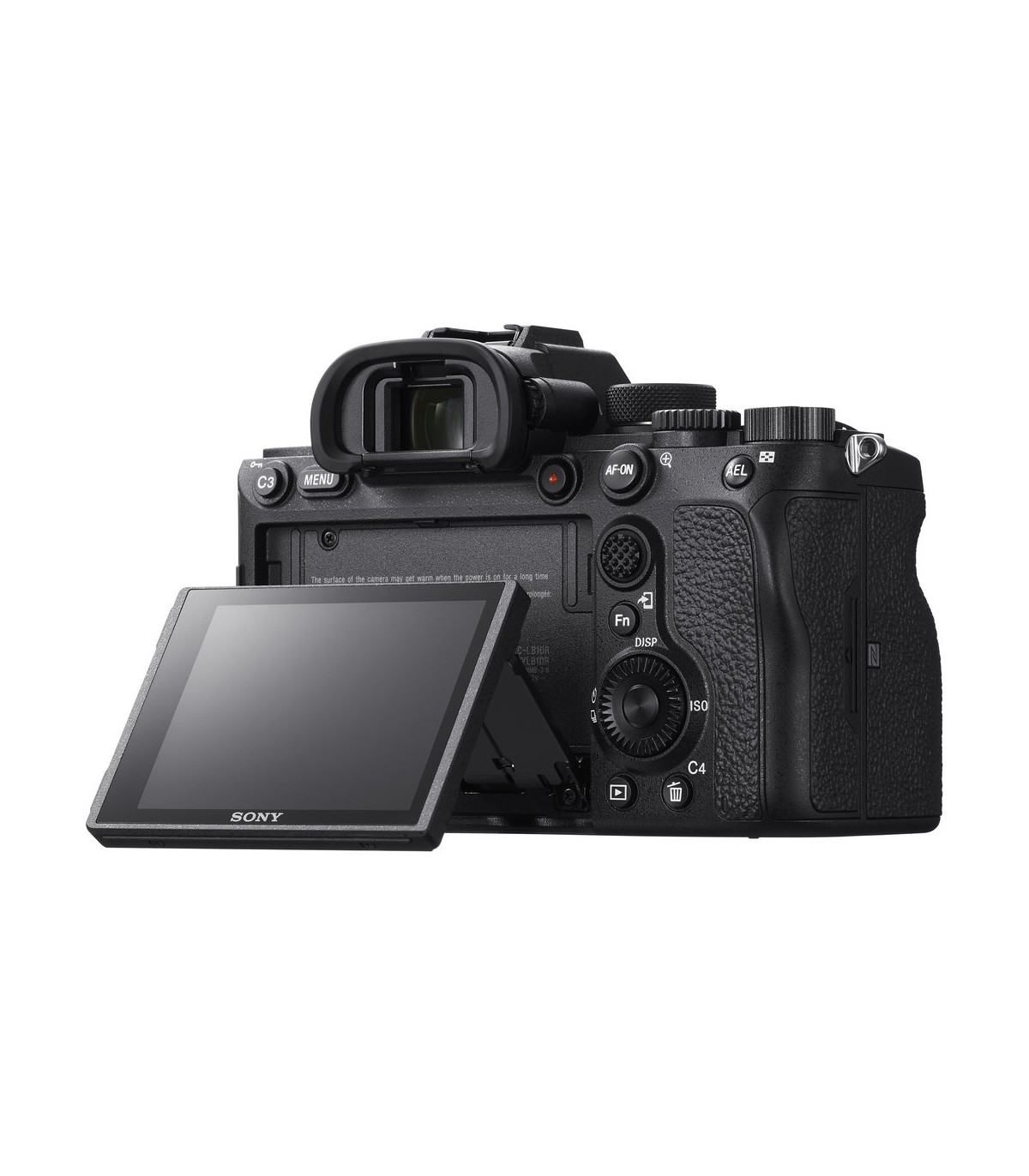 در بخش پشتی سونی a7R IV نمایشگر ۳ اینچی دستگاه قرار دارد که از یک پنل LCD با رزولوشن ۱.۴۴ میلیون نقطه برخوردار است. این نمایشگر علاوه بر قابلیت استفاده لمسی، امکان چرخش هم داشته تا فرآیند کادربندی برای کاربر راحتتر صورت گیرد. در بالای نمایشگر نیز منظره یاب الکترونیکی دوربین قرار گرفته که دارای رزولوشن بسیار بالای ۵.۷۶ میلیون نقطهای است که توسط یک پنل OLED در اختیار کاربر قرار میگیرد. علاوه بر رزولوشن بالا، این منظره یاب دارای سرعت بهروزرسانی (Refresh Rate) بالای ۱۲۰ فریم بر ثانیهای نیز هست.