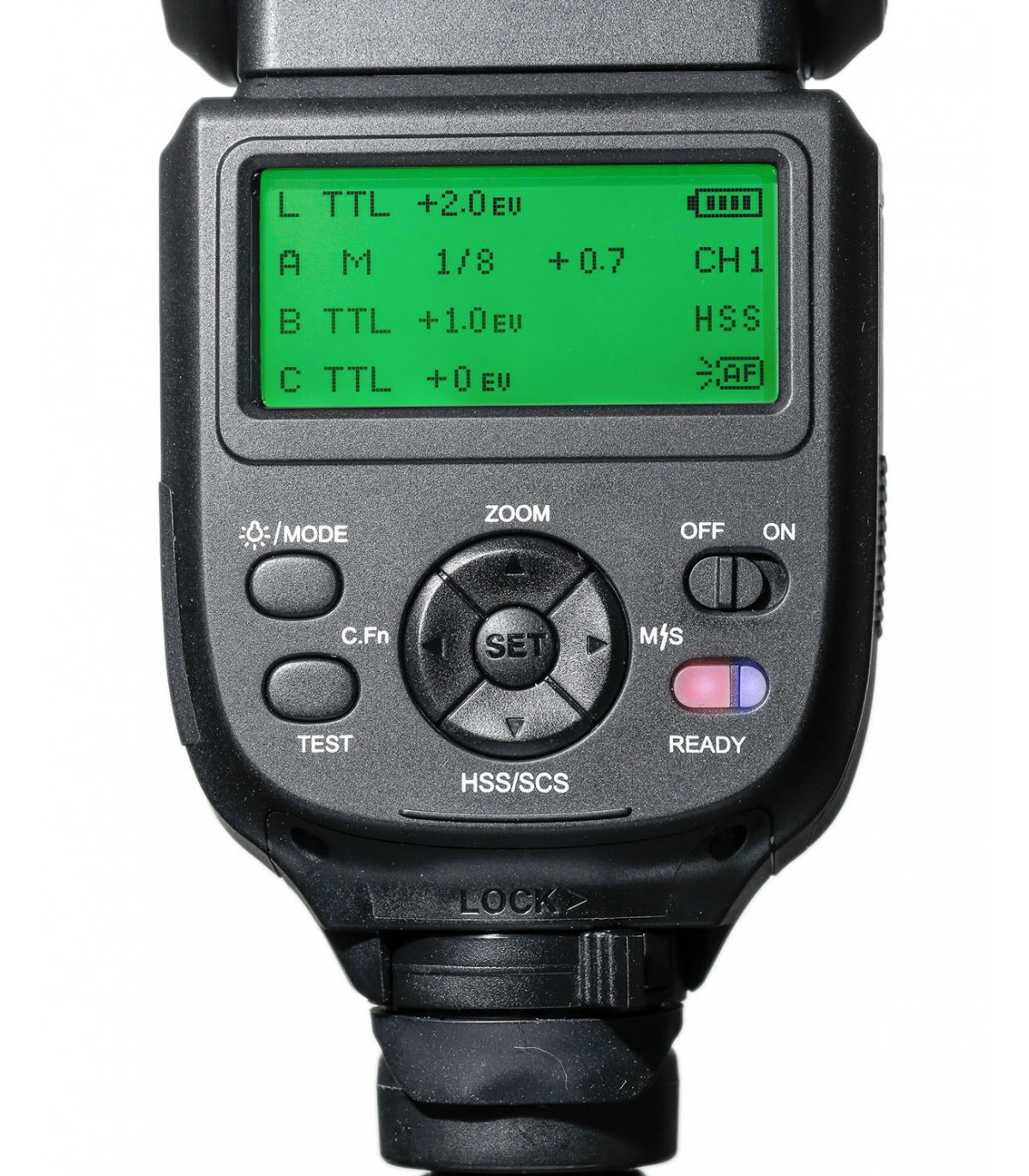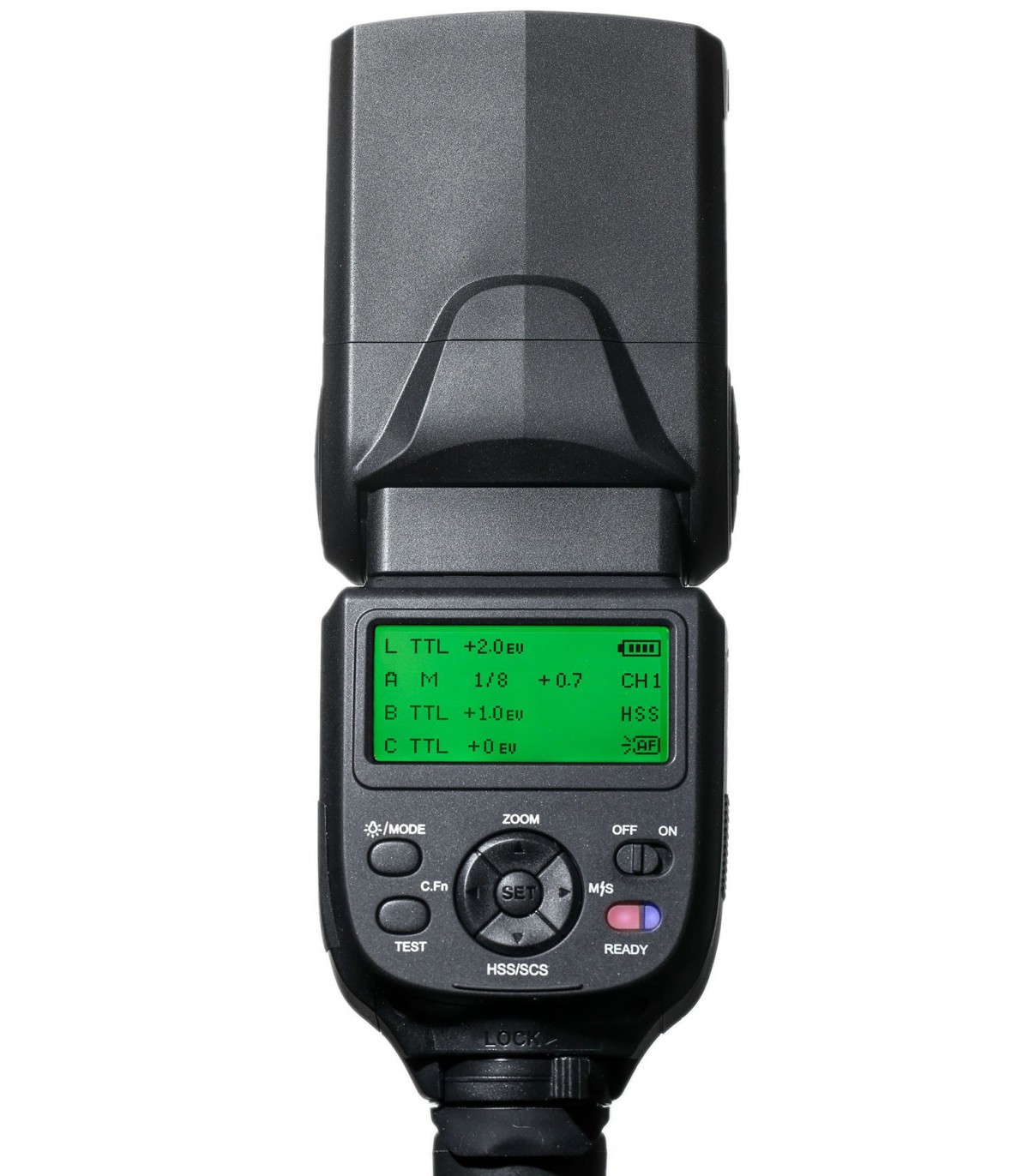 این فلاش گستره‌ی زوم معادل فاصله‌ی کانونی ۲۴ تا ۱۰۵ میلی‌متر را فراهم آورده و امکان چرخش افقی کامل ۳۶۰ درجه (۱۸۰ درجه از هر طرف) و چرخش عمودی -۷ تا ۹۰ درجه را در اختیار کاربر قرار می‌دهد. میزان اندک چرخش منفی به هنگام عکاسی از موضوعات نزدیک در هنگام استفاده بر روی دوربین و هم‌چنین برای تنظیم نورفلاش به منظور تابیدن نور به مرکز چتر (در حالت Off-Camera  و استفاده از چتر) بسیار کارآمد است.