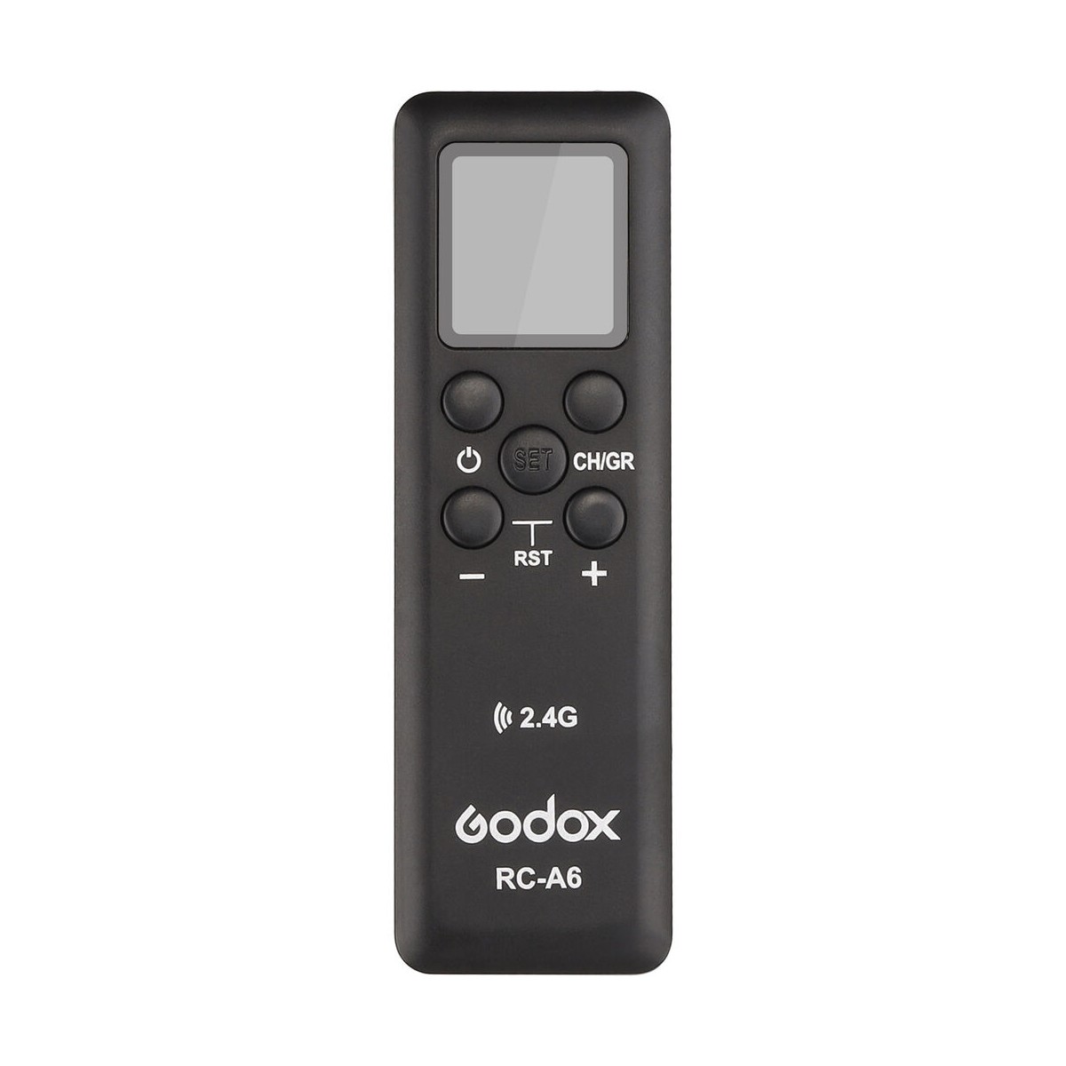 ریموت کنترلر RC-A6 گودوکس یک ریموت ۲.۴ گیگاهرتزی است که با استفاده از آن میتوان نورهای SL150II، SL200II، FV150، FV200 و LF308 کنترل کرد. این کنترلر تا مسافت ۵۰ متری در خط مستقیم قابل استفاده است. همچنین این کنترلر دارای ۳۲ کانال در ۱۶ گروه است که به واسطه همین امر هنگام استفاده از ریموت در محیطهایی که ترافیک امواج بیسیم وجود دارد، اختلالی پیش نخواهد آمد. این ریموت با استفاده از دو باتری نیمقلمی قابل استفاده است.