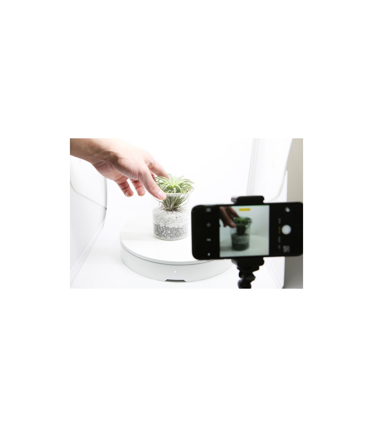 پایه چرخش خودکار ثبت تصاویر ۳۶۰ درجه Orangmonkie Foldio360 به راحتی درون خیمه Foldio2 Mini Studio یا انواع خیمههای دیگر قرار میگیرد و امکان تصویربرداری ۳۶۰ درجه را با استفاده از گوشی موبایل، دوربین DSLR یا بدون آینه فراهم میکند. این پایه چرخشی سفیدرنگ در قسمت پشتی به سیستم نورپردازی Halo Edge Light مجهز شده که باعث از بین رفتن خط تا پسزمینه در خیمه میشود و تصویری با پسزمینه یکدست ایجاد میکرد. سیستم عکاسی خودکار این محصول با استفاده از بلوتوث یا حسگرهای مادون قرمز (IR) به طور مستقیم به موبایل یا دوربین متصل میشود و با آن هماهنگ میشود. با فشردن یک دکمه بر روی این پایه، اپلیکیشن مخصوص Foldio360 فرایند عکاسی از تمام جهات محصول به صورت خودکار آغاز شده و در نهایت یک تصویر ۳۶۰ درجه مناسب برای قرارگیری بر روی صفحات وبسایت ایجاد میشود.