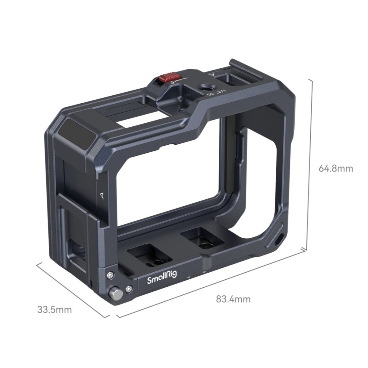 ابعاد کیج برابر با ۸۳.۴ × ۶۴.۸ × ۳۳.۵ میلیمتر است. این اندازهها به شکلی دقیق متناسب با ابعاد دوربینهای GoPro Hero نسل ۹ تا ۱۳ طراحی شده و هیچ فضایی اضافی یا مانعی در عملکرد دوربین ایجاد نمیکند.