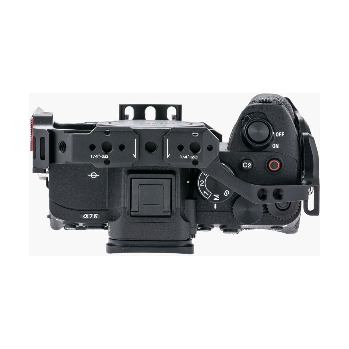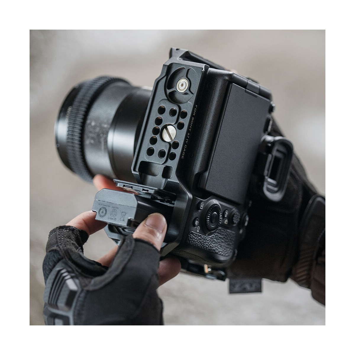 سطح کیج با پوشش مشکی مات طراحی شده که علاوه بر ظاهر حرفهای، مانع از انعکاسهای ناخواسته نور میشود. طراحی بدنه به گونهای است که با فرم ارگونومیک دوربینهای سری a7 سونی همخوانی کامل داشته و به هیچ وجه مانع دسترسی کاربر به دکمهها، نمایشگر متحرک، درگاهها و باتری نمیشود. این ویژگی برای فیلمسازانی که در شرایط سریع و متغیر کار میکنند اهمیت حیاتی دارد.