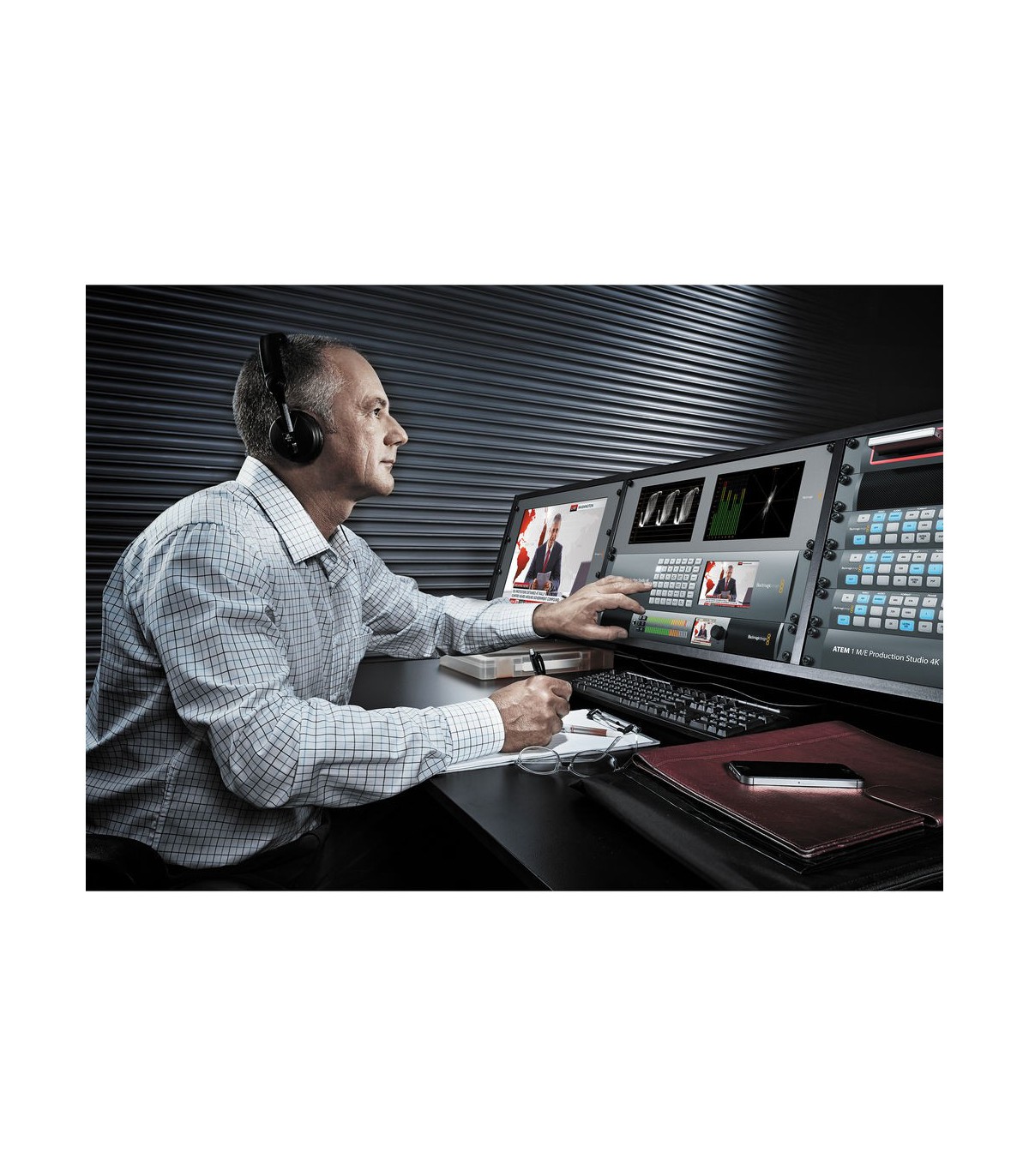 سوئیچر ATEM 2 M/E Production Studio 4K محصولی از بلک مجیک برای کنترل رویدادهایی است که با تعداد زیادی دوربین پوشش داده میشوند. این سوئیچر دارای بیست ورودی 6G-SDI روی بدنهای فلزی با سایز استاندارد 2 RU است که مناسب برای جاگیری در شاسیهای مخصوص طراحی شده است. این دستگاه با پشتیبانی از استانداردهای تصویر NTSC/PAL/HD/UltraHD 4K با حداکثر ابعاد 3840x2160 گزینهای مناسب برای برنامهسازان است. تمام تغییرات انجام شده با این سوئیچر بلافاصله در لحظه بر روی تصاویر اعمال میشوند. سوئیچر ATEM 2 M/E Production Studio 4K دارای خروجیهای SDI و HDMI با کیفیت HD نیز هست که کار تبدیل همزمان و انتقال تصاویر UHD با ابعاد HD را از طریق آنها انجام میدهد.