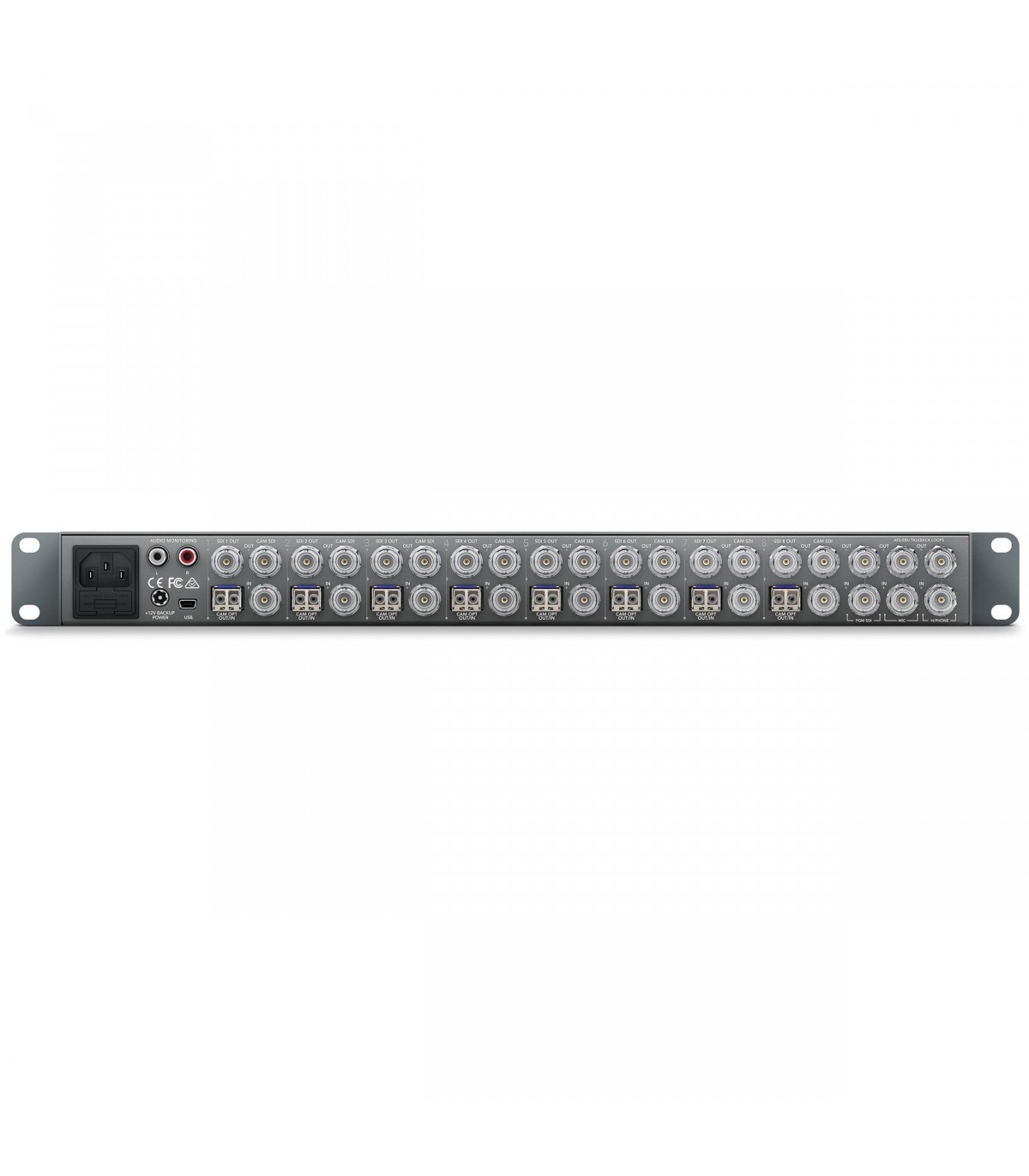اما بخش پشتی به اتصال ورودیها و خروجیها مربوط میشود که امکان ارتباط این دستگاه با هشت دوربین را فراهم میکنند. هر یک از هشت بخش دارای یک درگاه اپتیکال و سه درگاه SDI است. امکان استفاده مستقیم از تصویر و صدای هر یک از بخشها برای انتقال به دیگر دستگاهها موجود است. درگاههای SDI این دستگاه از نوع 12G-SDI هستند و تصاویر 4K با ابعاد 4096x2160 را پشتیبانی میکنند.