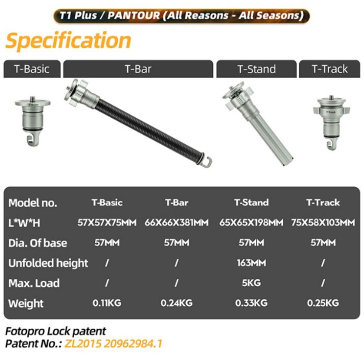• سازگاری با ستونهای میانی متنوع نظیر T-Basic، T-Track و T-Stand که قابلیتهایی مثل تبدیل سهپایه به مینیپایه، نصب تراز دیجیتال یا افزایش ارتفاع ویژه را فراهم میکنند.
