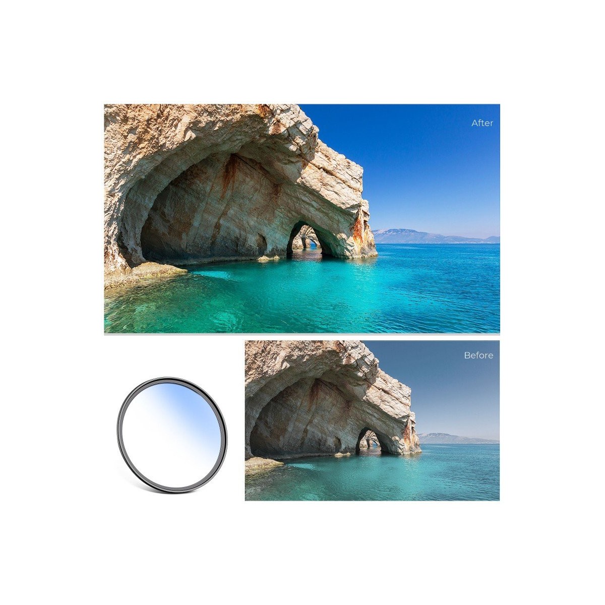 یکی از مهمترین ویژگیهای این فیلتر، قابلیت کاهش اشعهی فرابنفش (UV) است. این اشعهها که در نور خورشید وجود دارند، باعث کاهش وضوح تصویر و ایجاد حالتی از مهگرفتگی در عکسها میشوند. با استفاده از این فیلتر، تأثیر اشعهی UV کاهش یافته و تصاویر با شفافیت و وضوح بیشتری ثبت میشوند. این ویژگی مخصوصاً برای عکاسی در محیطهای باز، کوهستانی و ساحلی که نور خورشید شدت بیشتری دارد، بسیار مفید است.