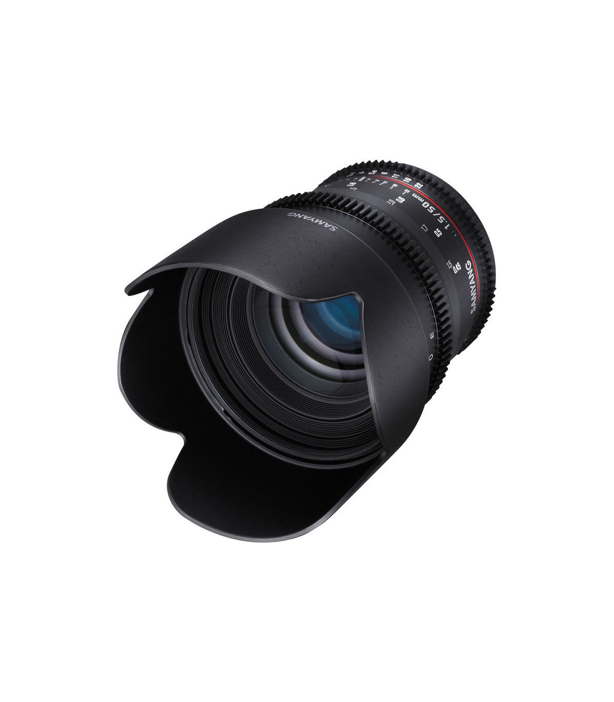 لنز Samyang 50mm T1.5 VDSLR AS UMC یک لنز پرایم با دیافراگم نسبتا باز T1.5 میباشد که برای تصویربرداری در نور کم بسیار مناسب است. عمق میدان بسیار کم در این دیافراگم ۸ تیغهای پس زمینه و بوکهای بسیار زیبا و ملایم را ایجاد میکند. از آنجا که این لنز مخصوص تصویربرداری با دوربینهای DSLR طراحی شده است، بدنه این لنز دارای طراحی استاندارد مخصوص لنزهای سینمایی است، و رینگهای تنظیم جداگانهای برای دیافراگم و فوکوس روی بدنه قرار گرفته که امکان کنترل دستی یا کنترل توسط تجهیزات Follow Focus را به کاربر میدهد. رینگ فوکوس این لنز دارای طول چرخش نسبتا طولانی است تا دقت در هنگام فوکوسکشی دستی را بالاتر ببرد. حداقل فاصله فوکوس در این لنز برابر ۵۰ میلیمتر بوده و فوکوس آن به صورت داخلی انجام میشود تا حداقل میزان لرزش رو روی لنز ایجاد کند.