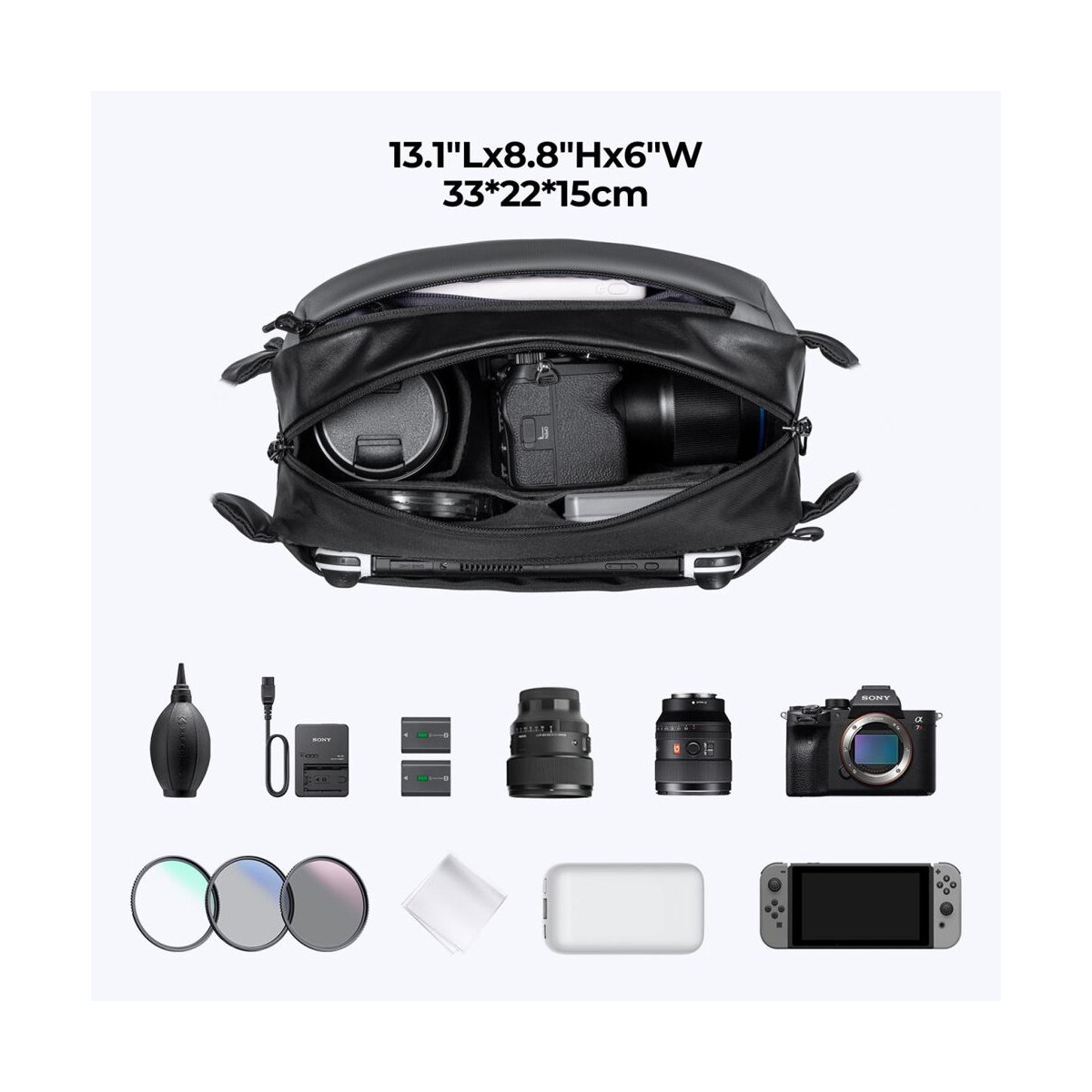 این کیف دارای چندین جیب داخلی و خارجی است که امکان دسترسی سریع به وسایل ضروری مانند کارت حافظه، باتری و کابلها را فراهم میکند. همچنین، فضای کافی برای جایگذاری لوازم شخصی کوچک مانند گوشی همراه، کلید و کیف پول در این کیف در نظر گرفته شده است.